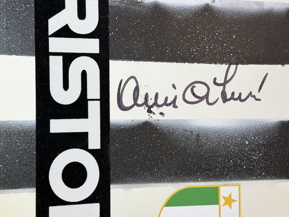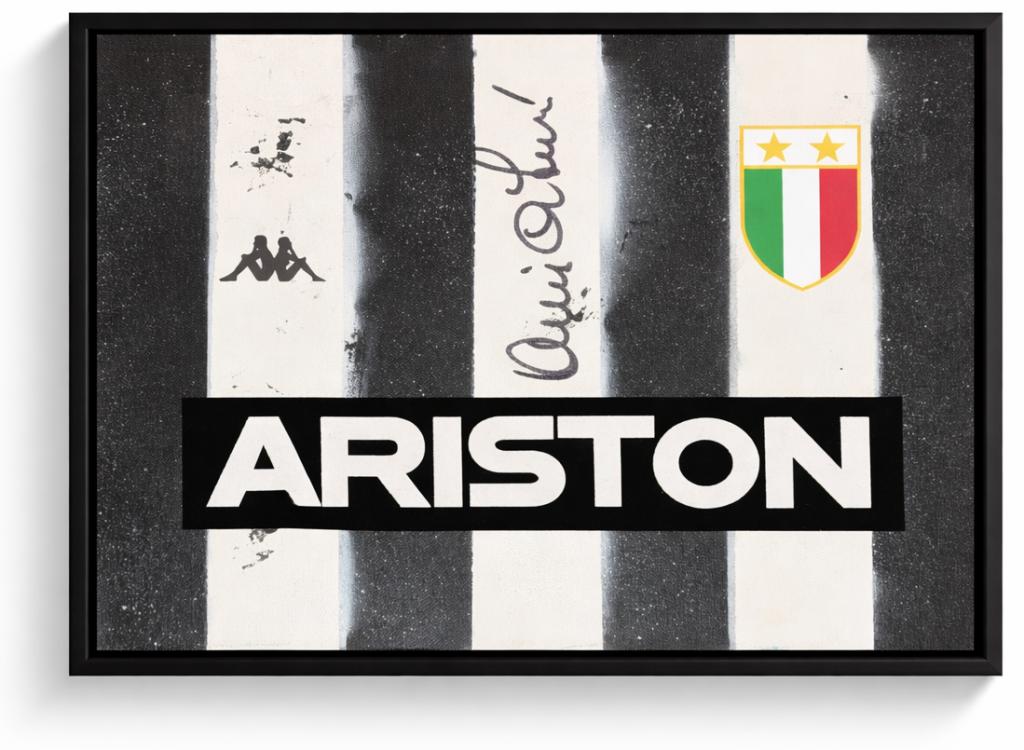 Autografo di Antonio Cabrini su tela raffigurante la storica maglia della Juventus con sponsor ARISTON e scudetto tricolore, dimensioni 30x40 cm, già incorniciata con cornice nera a battuta. Si tratta di una Legends Painting, concepita come una vera e propria tela artistica contemporanea, con nameset e dettagli applicati sulla superficie, arricchita da una lavorazione grafica nei colori bianconeri e texture a effetto spray.