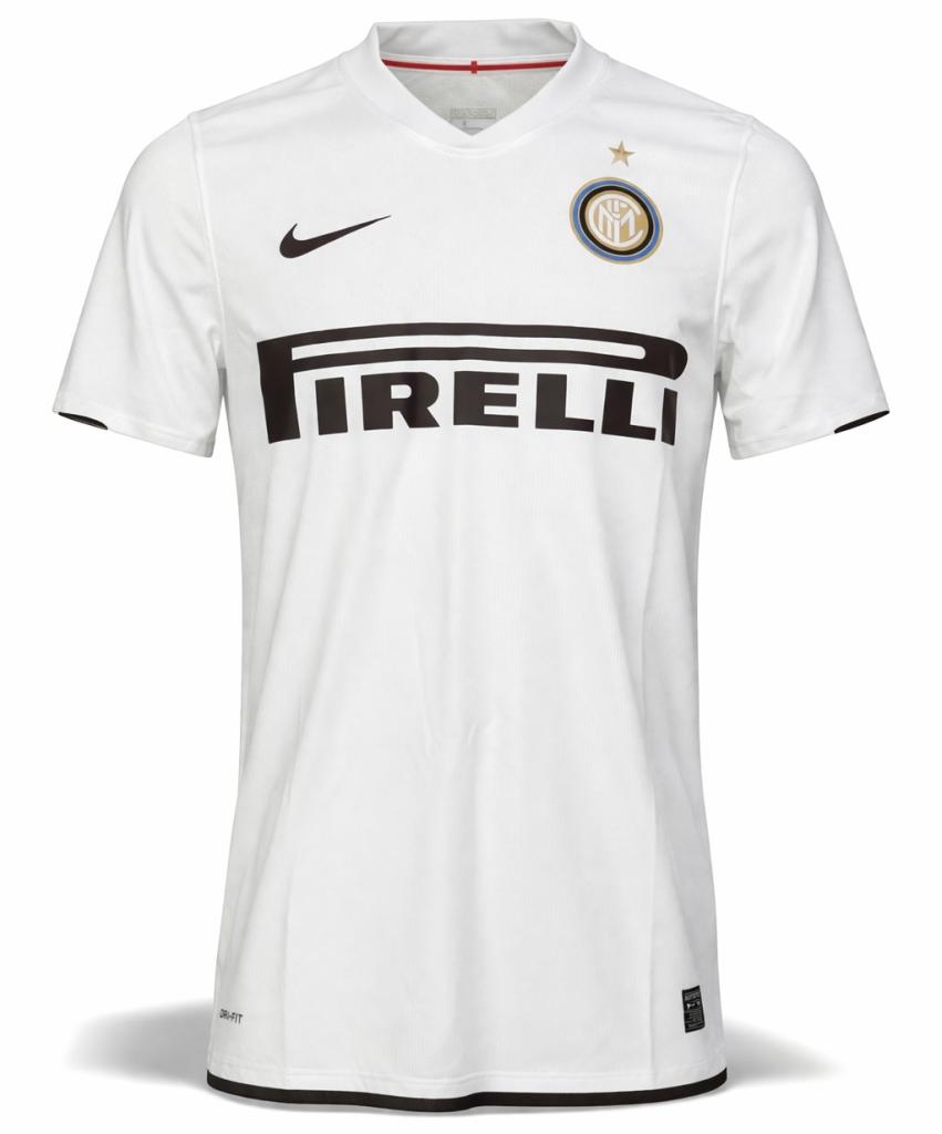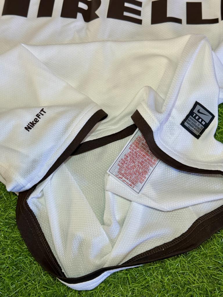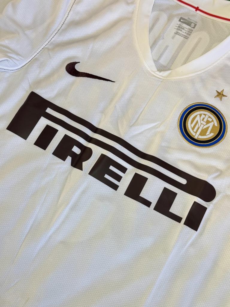 Divisa Away realizzata da Nike per la stagione 2008/2009, caratterizzata dal design pulito in bianco con dettagli marroni, sul petto sono presenti lo sponsor Pirelli e lo swoosh Nike. Il crest dell’Inter è impreziosito dalla stella e dal bordo tricolore celebrativo. Il colletto a V e le finiture scure su maniche e fondo completano uno stile elegante e distintivo.