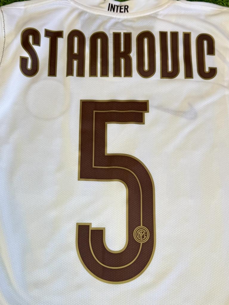 All’interno del colletto è presente il richiamo celebrativo alla storia del club. Sul retro troviamo nameset STANKOVIC e numero 5 in stampa ufficiale, con finitura marrone e bordi dorati. Taglia S, versione Store con tecnologia NikeFIT.
