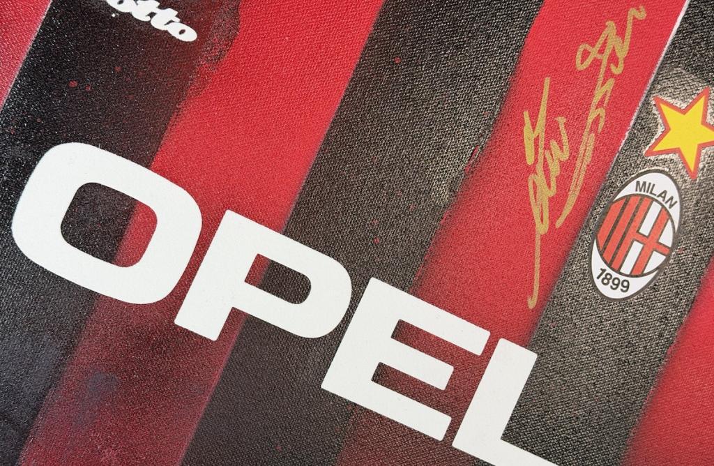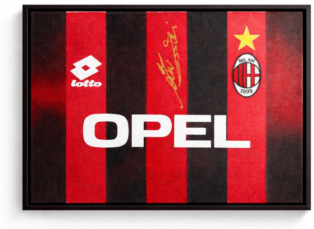 Autografo di Mauro Tassotti su tela raffigurante la storica maglia del Milan con sponsor OPEL, logo Lotto e stemma societario con stella, dimensioni 30x40 cm, già incorniciata con cornice nera a battuta. Si tratta di una Legends Painting, concepita come una vera e propria tela artistica contemporanea, con nameset e dettagli applicati sulla superficie, arricchita da una lavorazione grafica nei colori rossoneri e texture a effetto spray.