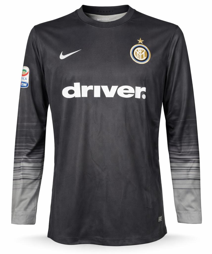 Divisa portiere realizzata da Nike per la stagione 2015/2016, caratterizzata da una base nera con sfumature grigie sulle maniche e grafica orizzontale tono su tono. Sul petto sono presenti il logo Nike, lo stemma dell’Inter con stella e lo sponsor commerciale Driver.