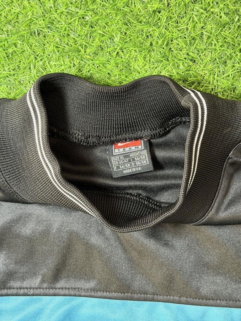 Il modello è a maniche lunghe con polsini elasticizzati e collo alto in maglieria con doppia riga a contrasto. Il tessuto è in poliestere lucido, caratteristico delle produzioni Nike di fine anni ’90, con struttura resistente e vestibilità ampia pensata per l’utilizzo agonistico.