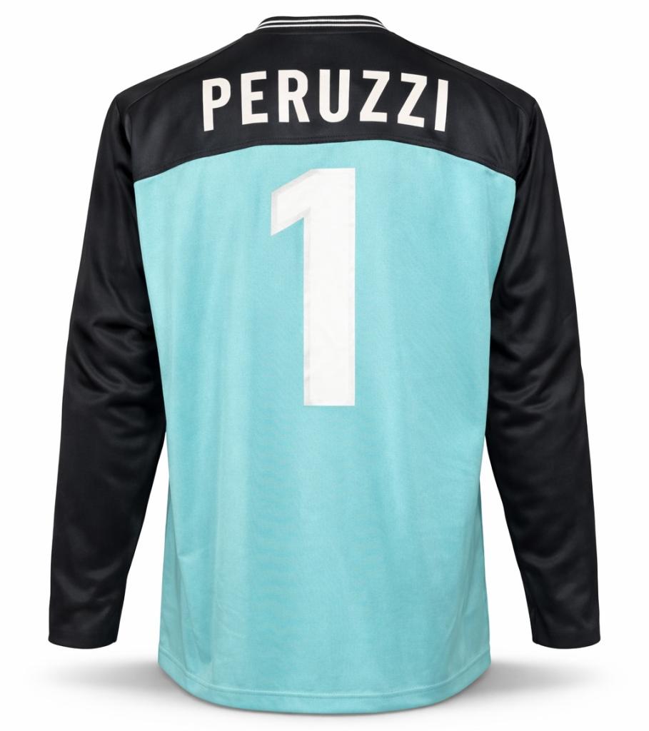 Sul retro è presente la personalizzazione PERUZZI e il numero 1 in bianco, in grande formato e con applicazione conforme agli standard utilizzati in campo nella stagione.