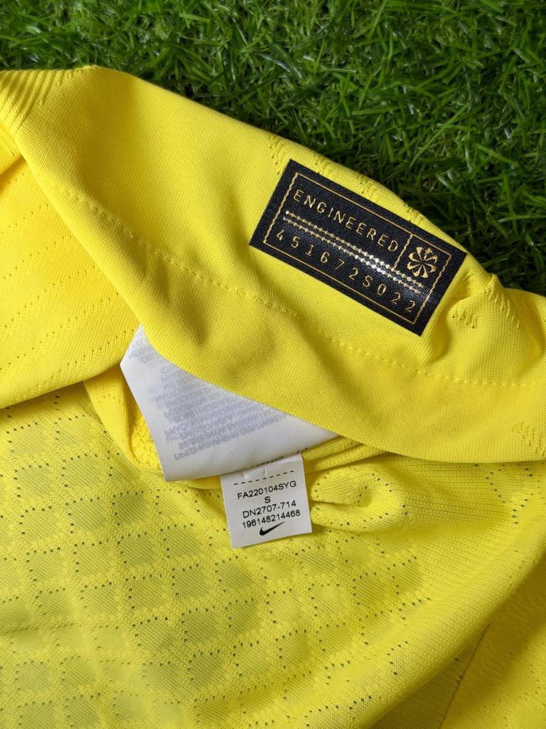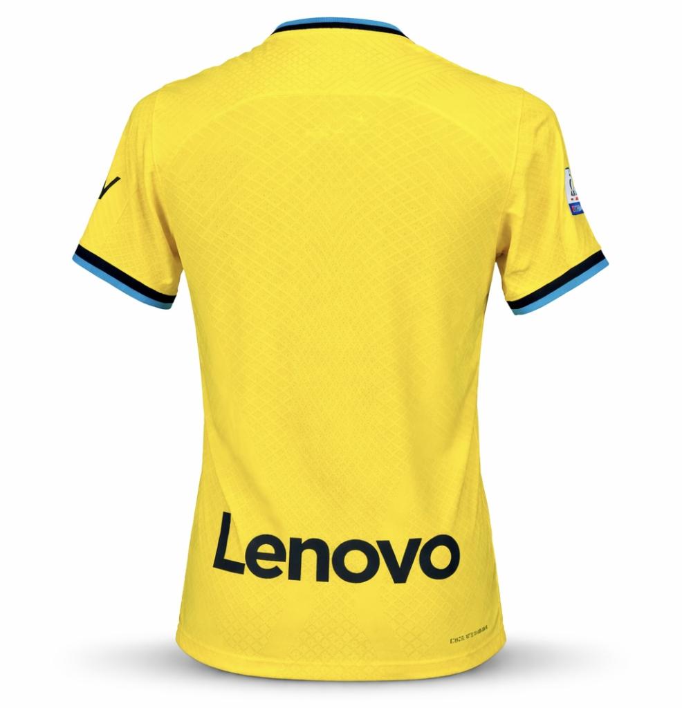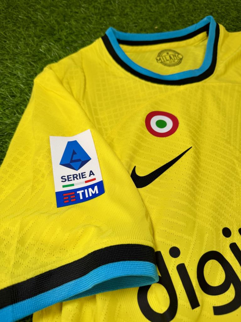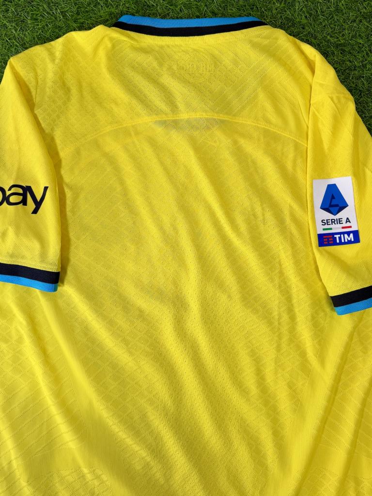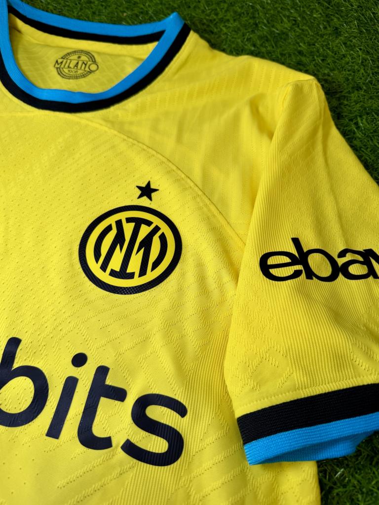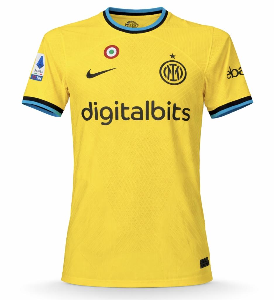 Maglia Third dell’Inter stagione 2022/2023 realizzata da Nike, versione store authentic, caratterizzata da una base gialla con dettagli neri e profili azzurri su colletto e maniche. Sul petto sono presenti lo swoosh Nike, lo stemma del club con una stella, la coccarda tricolore e lo sponsor commerciale digitalbits.