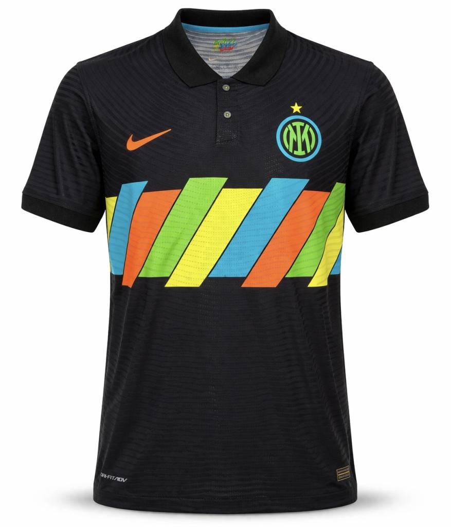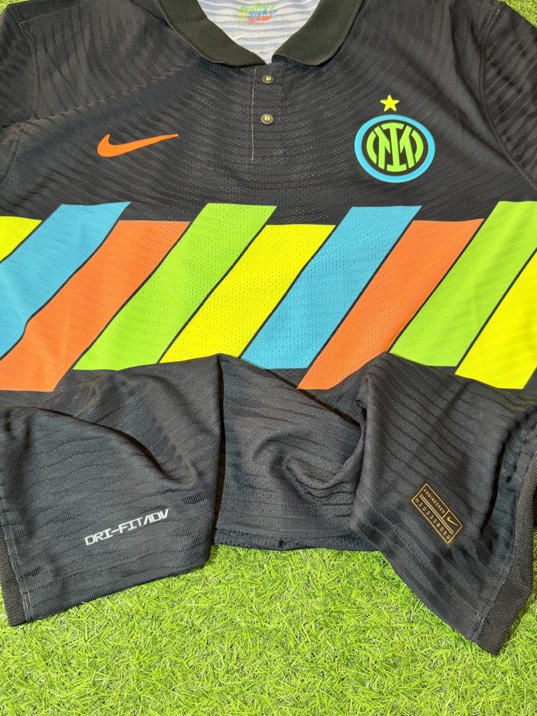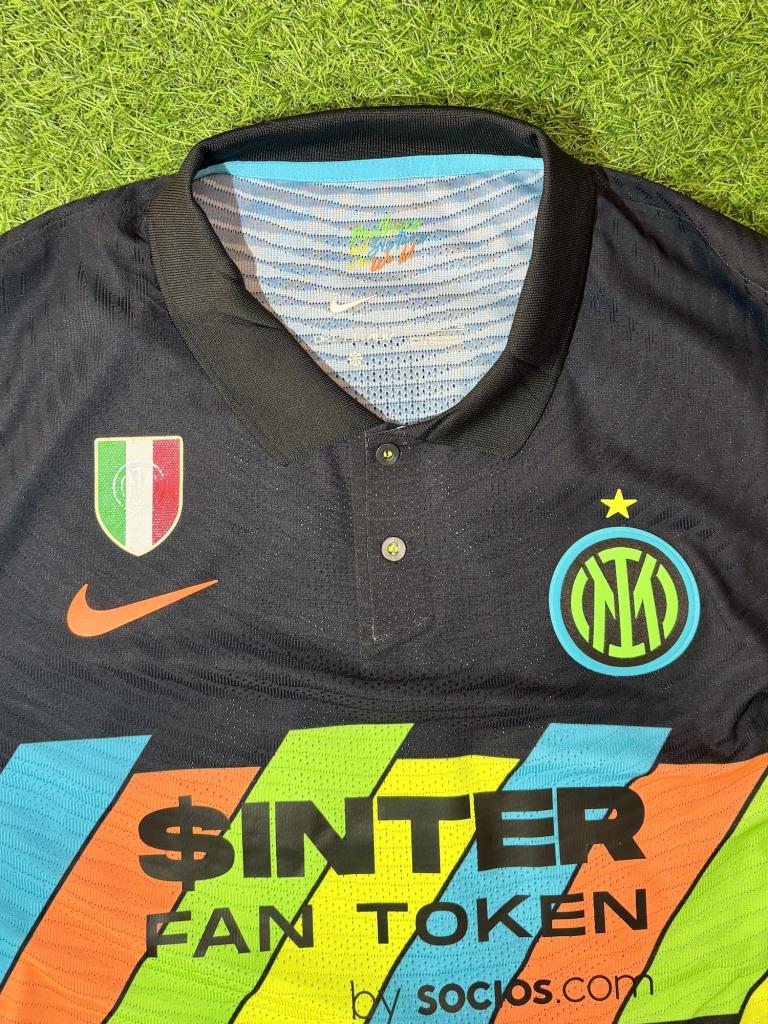 Maglia Third dell’Inter di Bastoni della stagione 2021-2022, versione store authentic con grafica multicolor distintiva.