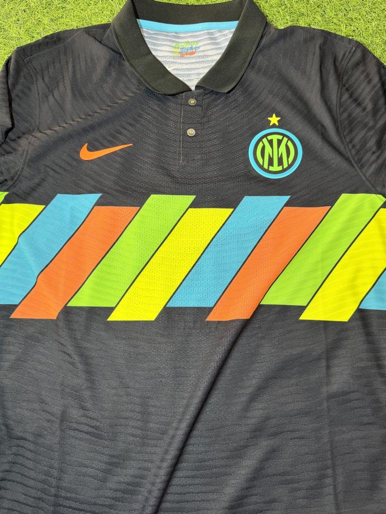 Maglia Third dell’Inter per la stagione 2021-2022, realizzata da Nike e utilizzata da Alessandro Bastoni nelle competizioni ufficiali. Versione store authentic. Il design presenta una base nera con trama tono su tono arricchita da una fascia frontale caratterizzata da inserti diagonali multicolor in tonalità fluo, elemento distintivo della divisa.