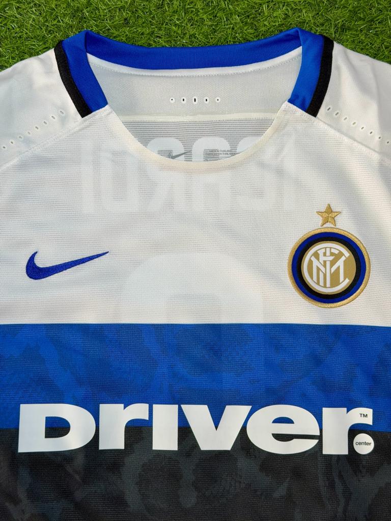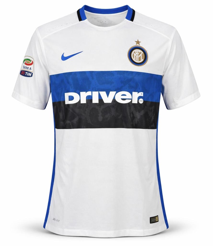 Il design presenta una base bianca con banda orizzontale nerazzurra sul petto, arricchita da una texture tono su tono, mentre il colletto girocollo con inserto blu e nero completa lo stile della divisa. Sul fronte sono presenti swoosh Nike e sponsor commerciale Driver, mentre sulla manica è applicata la patch Serie A TIM.