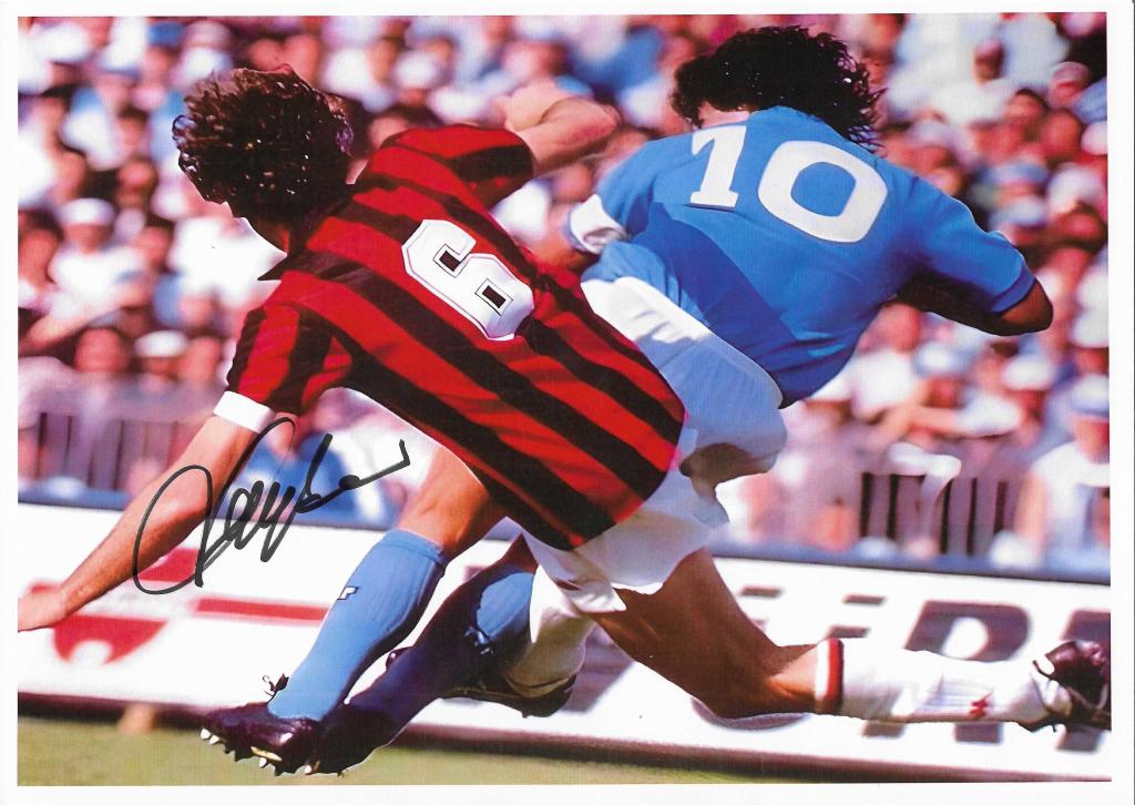 Autografo di Franco Baresi su fotografia a colori che lo ritrae in azione con la maglia del Milan numero 6 durante un contrasto di gioco con Diego Armando Maradona, riconoscibile con la maglia del Napoli numero 10. Firma apposta in pennarello nero nella parte sinistra dell’immagine.