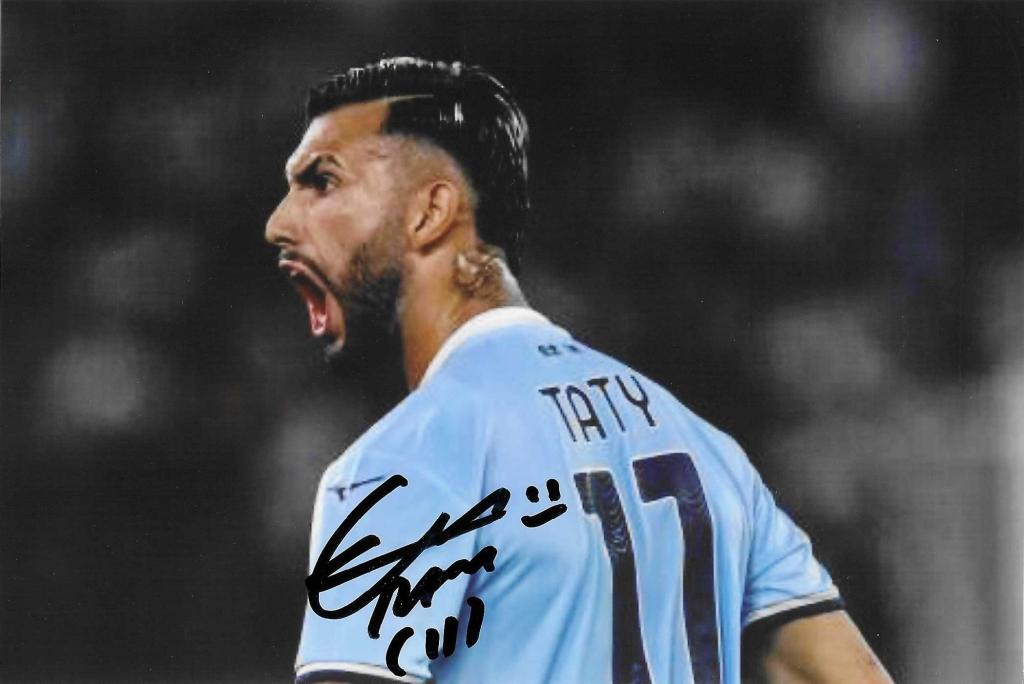 Autografo di Valentín “Taty” Castellanos su fotografia a colori che lo ritrae con la maglia della Lazio numero 17 durante un’esultanza in campo. Presente dedica autografa con firma apposta in pennarello nero sulla parte sinistra dell’immagine.