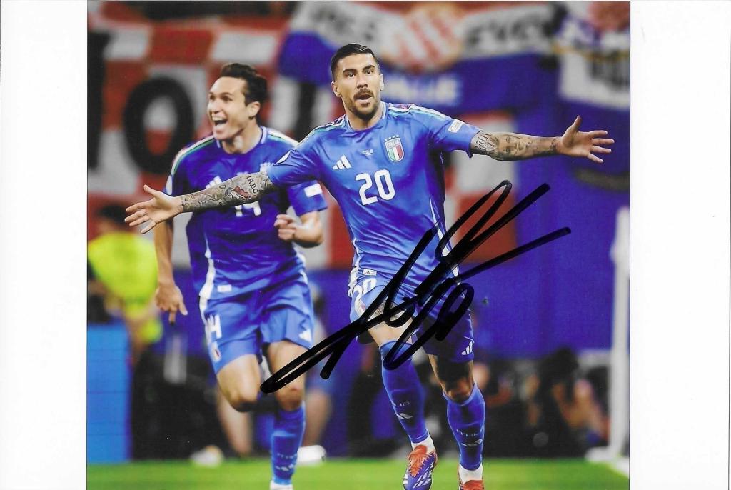 Autografo di Mattia Zaccagni su foto in esultanza con Italia, con Chiesa sullo sfondo. Cimelio legato alla Nazionale italiana.