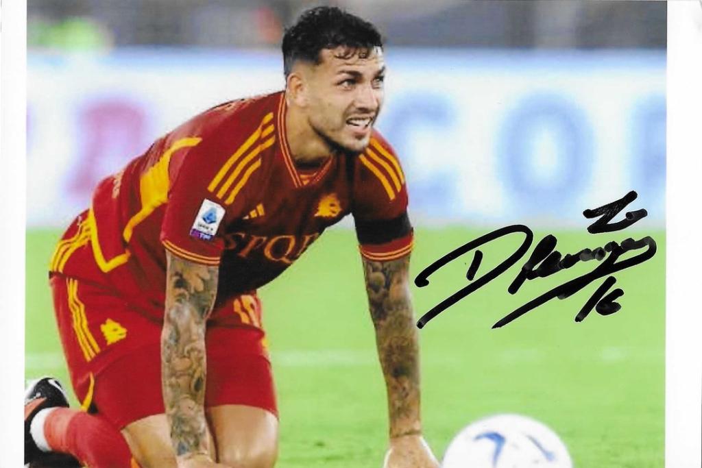 Autografo di Leandro Paredes su foto con maglia Associazione Sportiva Roma. Cimelio del centrocampista argentino campione del mondo.