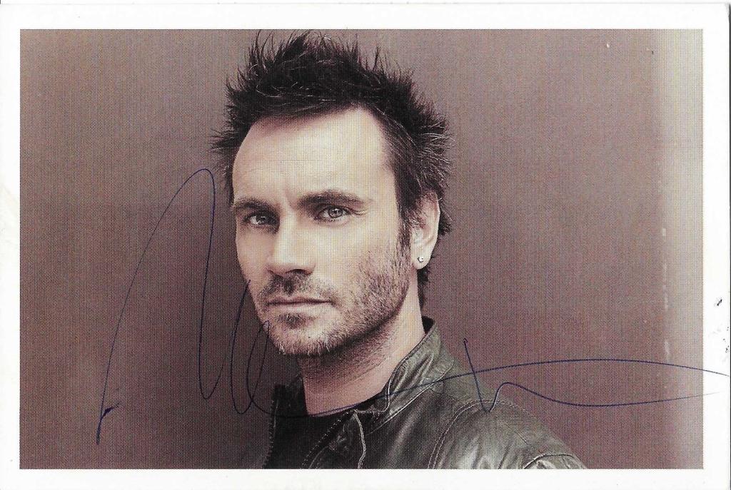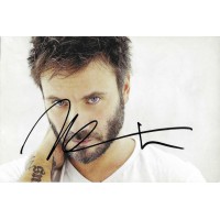 Autografo di Nek su fotografia a colori che lo ritrae in primo piano, con giacca in pelle. Firma apposta in pennarello sulla superficie dell’immagine.