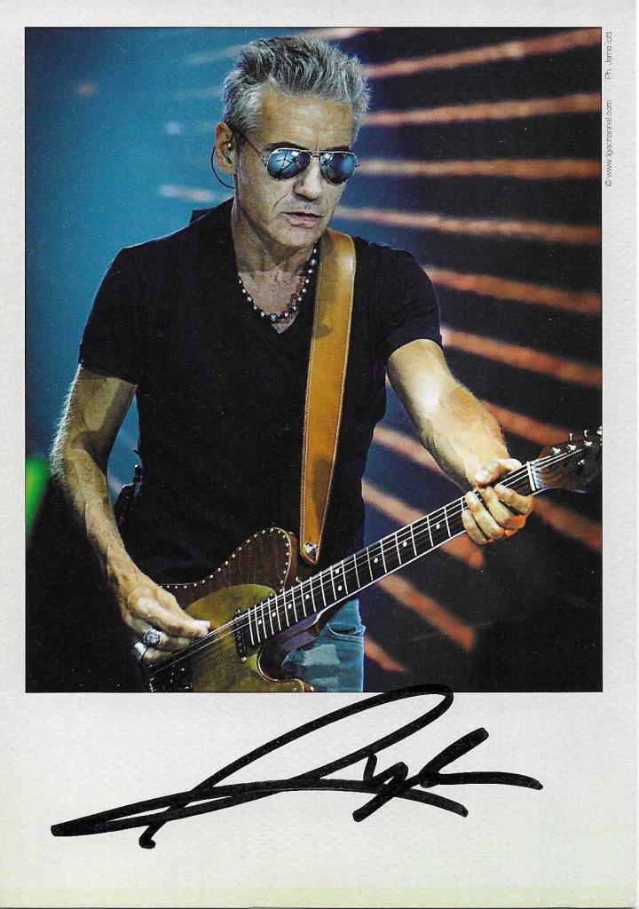 Autografo di Luciano Ligabue su fotografia durante live con chitarra. Cimelio legato alla musica rock italiana e alla carriera dell’artista