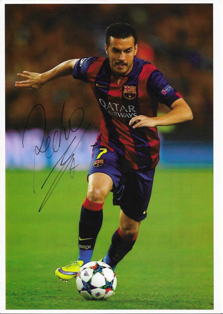 Autografo di Pedro Rodríguez su fotografia a colori che lo ritrae in azione in maglia Barcellona durante una fase di gioco. Firma apposta in pennarello sulla parte frontale dell’immagine.