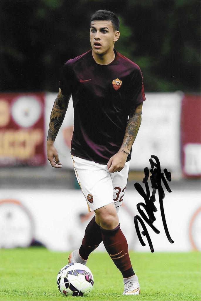 Autografo di Leandro Paredes su fotografia in azione con maglia Roma e pallone in gioco. Cimelio legato al calcio e al giocatore argentino.
