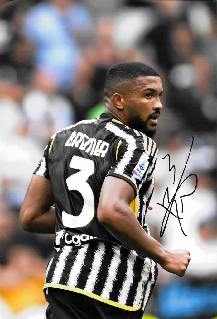 Autografo di Bremer su fotografia a colori che lo ritrae di spalle con maglia Juventus numero 3 e nome visibile, durante una fase di gioco. Firma apposta in pennarello nero sulla parte destra dell’immagine.