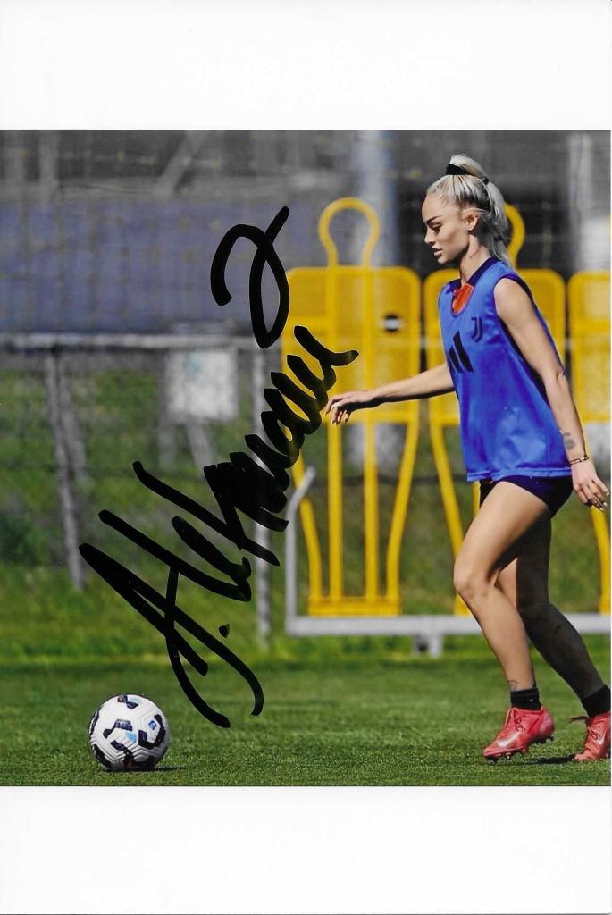 Autografo di Alisha Lehmann su fotografia in allenamento con pettorina Juventus. Cimelio legato al calcio femminile e alla carriera.