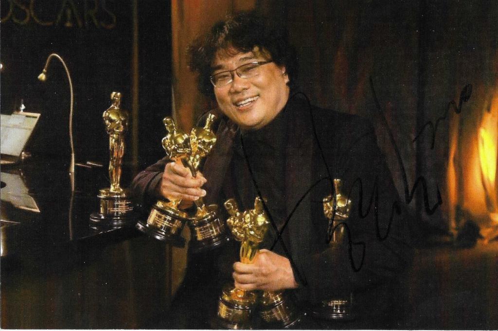 Autografo di Bong Joon-ho su fotografia con premi Oscar