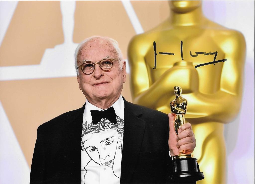 Autografo di James Ivory su fotografia che lo ritrae in abito elegante mentre tiene in mano una statuetta degli Oscar. Firma apposta in pennarello nella parte superiore dell’immagine.