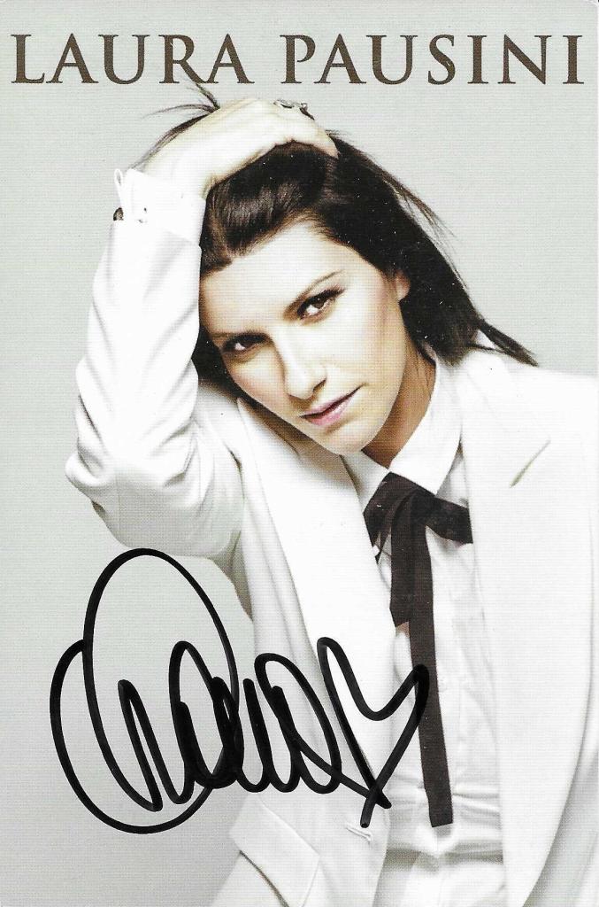 Autografo di Laura Pausini su fotografia promozionale che la ritrae in primo piano, con abbigliamento chiaro e nome stampato “Laura Pausini” nella parte superiore dell’immagine. Firma apposta in pennarello nero nella parte inferiore.