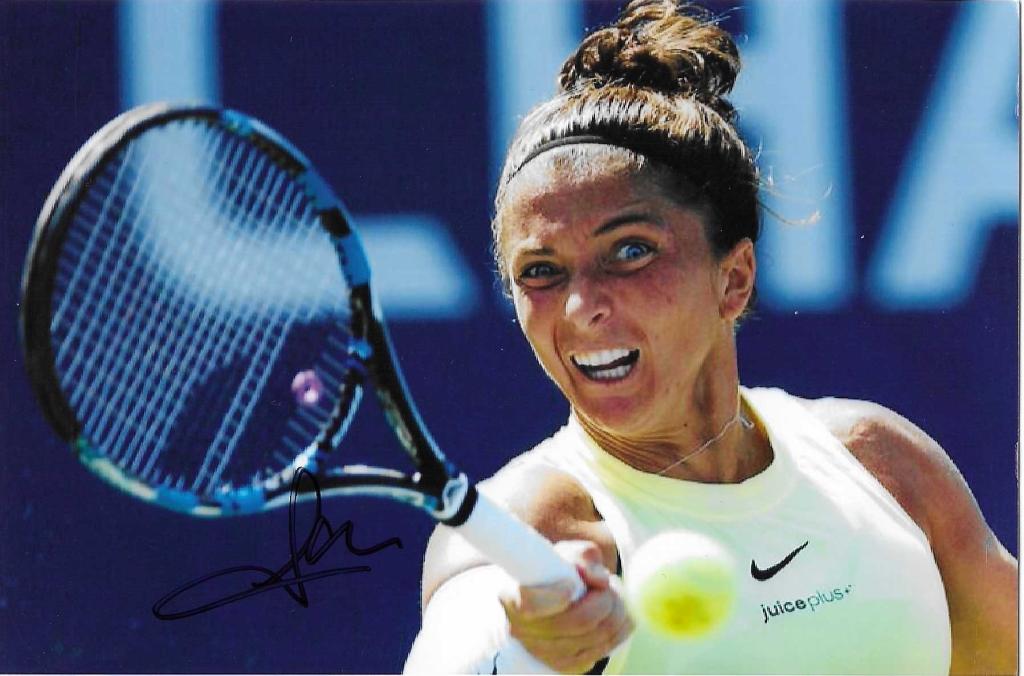Autografo originale di Sara Errani su fotografia in azione di gioco, ideale per collezionisti di tennis e memorabilia sportiva contemporanea