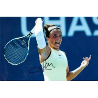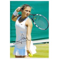Autografo di Sara Errani su fotografia in azione di gioco durante un incontro di tennis, firmata frontalmente dall’atleta.