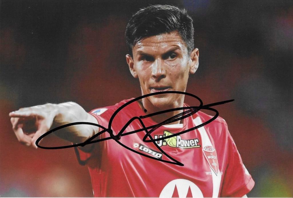 Autografo originale di Matteo Pessina su fotografia in primo piano con maglia Monza, ideale per collezionisti di calcio italiano moderno.