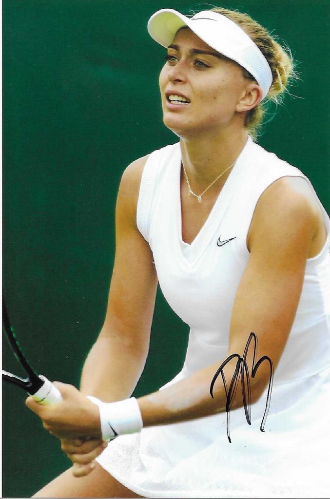 Autografo di Paula Badosa su fotografia in campo durante partita, ideale per collezionisti di tennis e memorabilia sportiva internazionale.