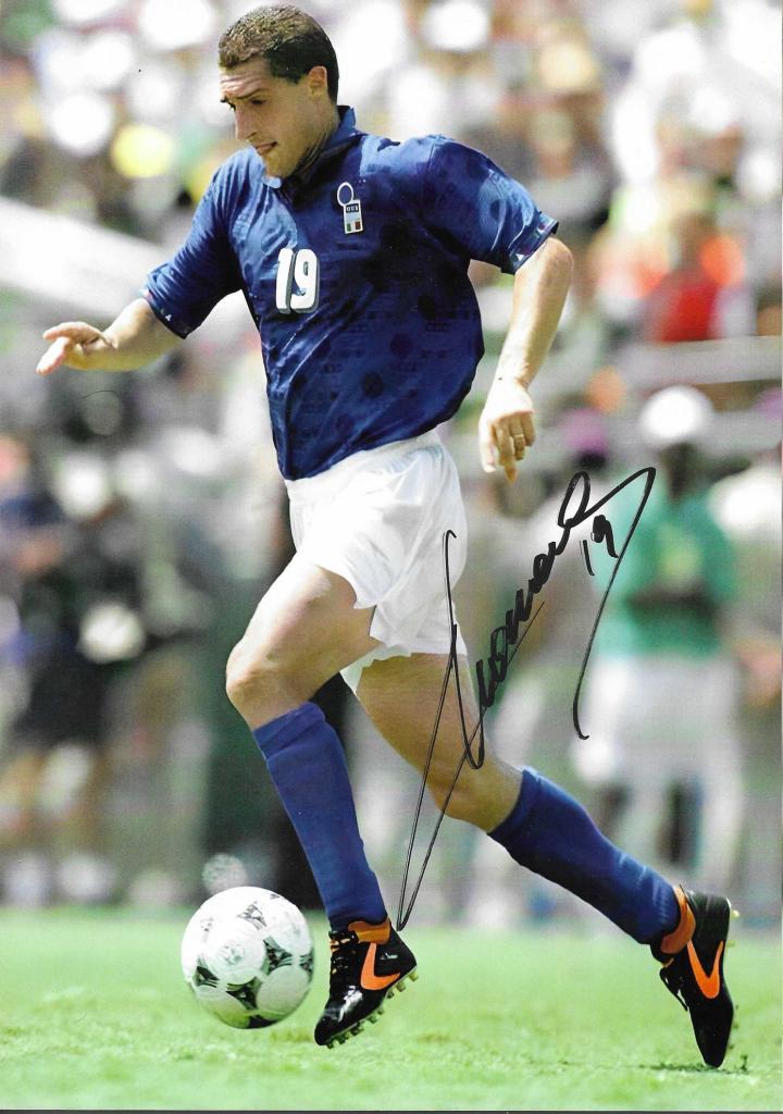 Fotografia autografata di Daniele Massaro in maglia azzurra numero 19 al Mondiale USA 1994. Firma in pennarello nero su scatto d'azione.