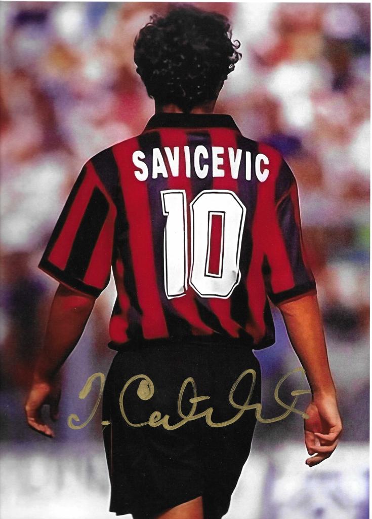 Autografo di Dejan Savicevic, il Genio del Milan. Fotografia con maglia rossonera numero 10 firmata in pennarello oro.