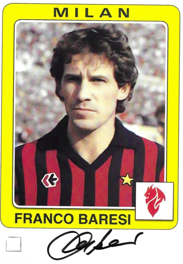 Autografo di Franco Baresi su cartoncino fotografico ufficiale a colori — ritratto in maglia rossonera con cornice gialla e nome in stampatello — firma in pennarello nero in basso.