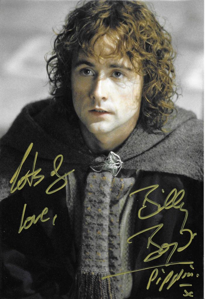 Autografo di Billy Boyd, Pipino nel Signore degli Anelli. Fotografia di scena firmata in pennarello oro con dedica.
