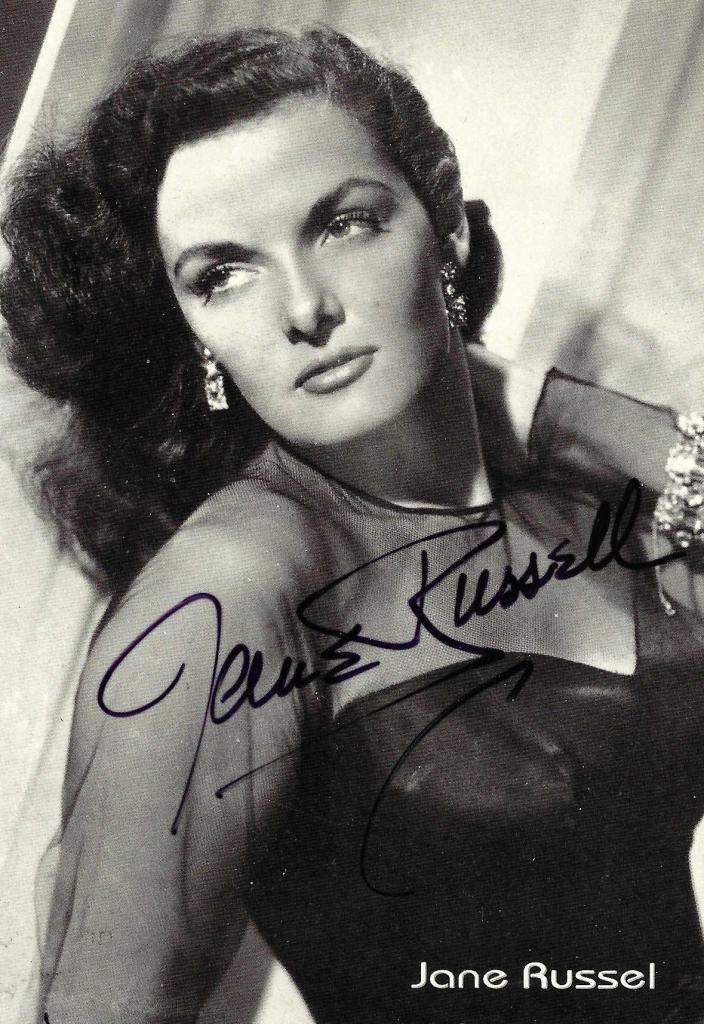 Autografo di Jane Russell, diva di Hollywood anni 40 e 50. Cartolina fotografica in bianco e nero firmata in pennarello blu.