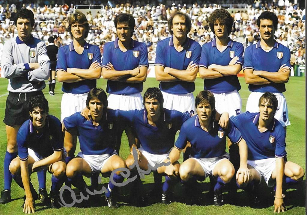 Autografo di Antonio Cabrini, Campione del Mondo con l'Italia nel 1982. Fotografia di squadra azzurra firmata in pennarello argento.