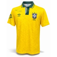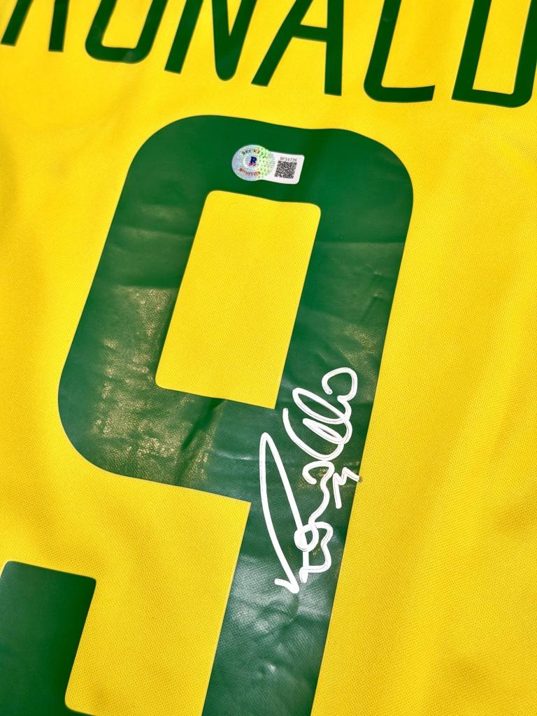 Maglia home del Brasile con personalizzazione Ronaldo numero 9 e autografo originale sul retro sul numero 9.
