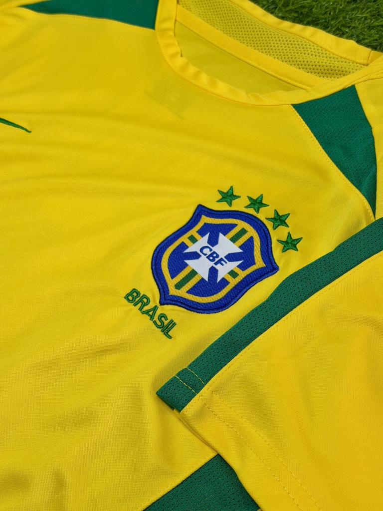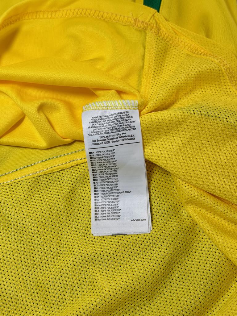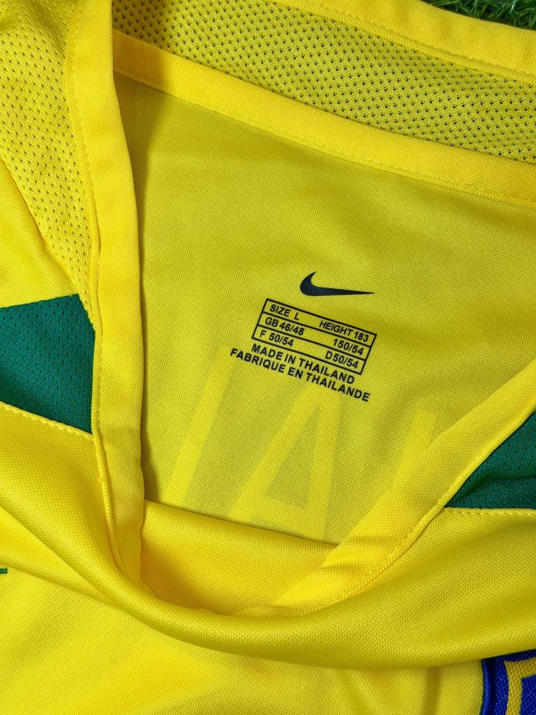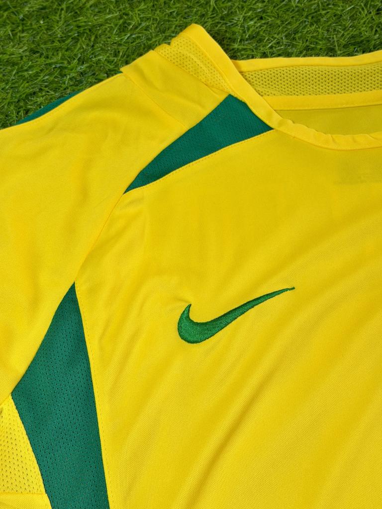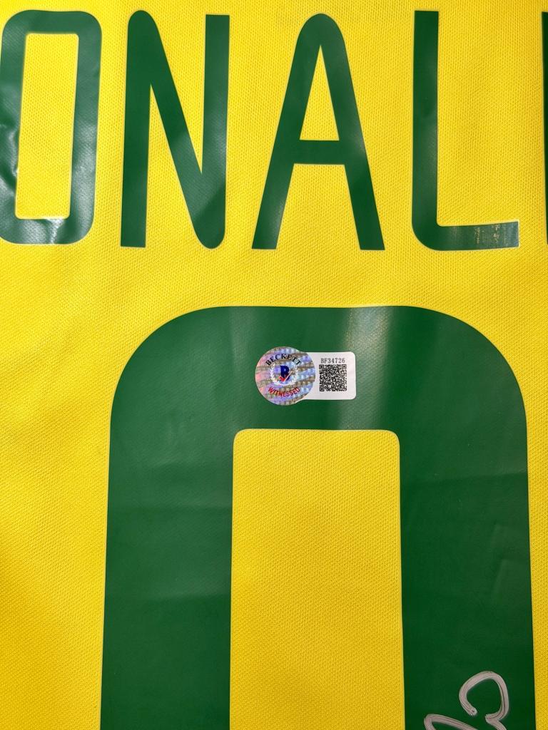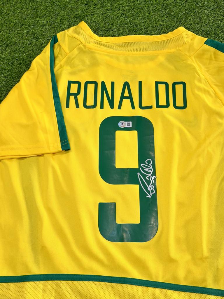 Autografo di Ronaldo il fenomeno sulla maglia Home del Brasile del 2002, caratterizzata dal classico colore giallo con inserti verdi e design Nike con pannelli laterali traspiranti.