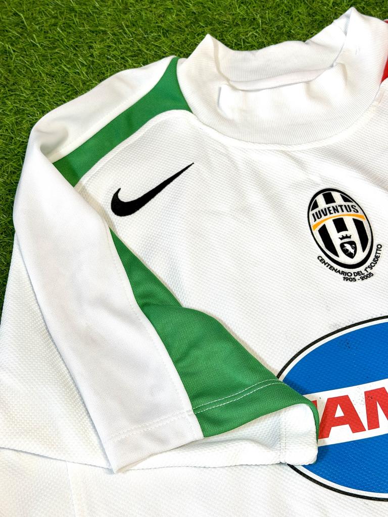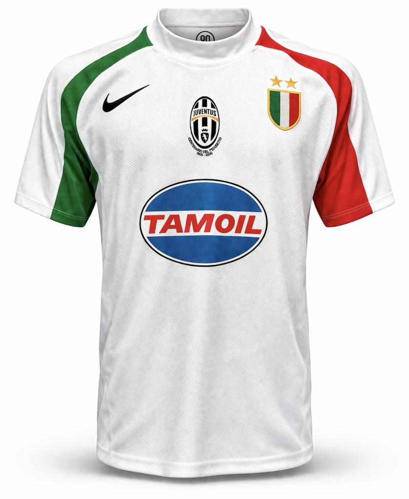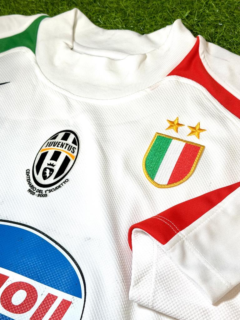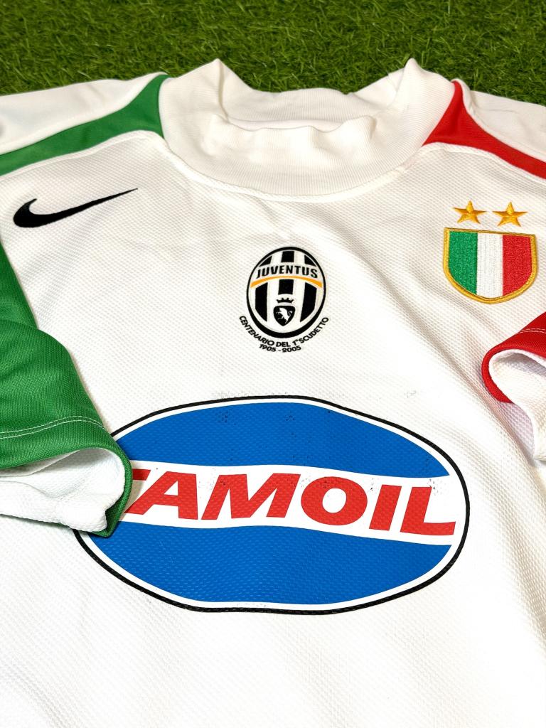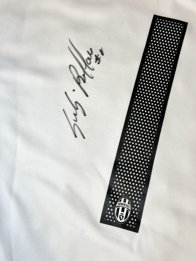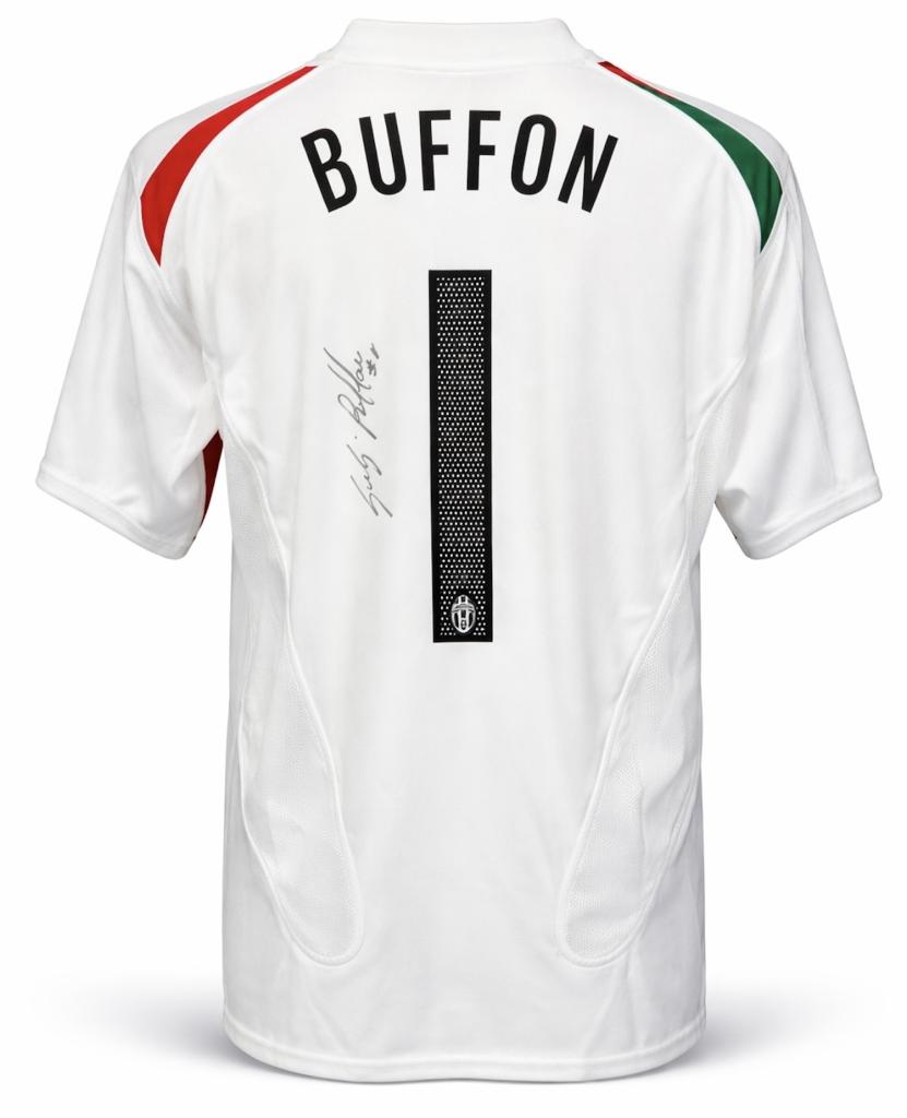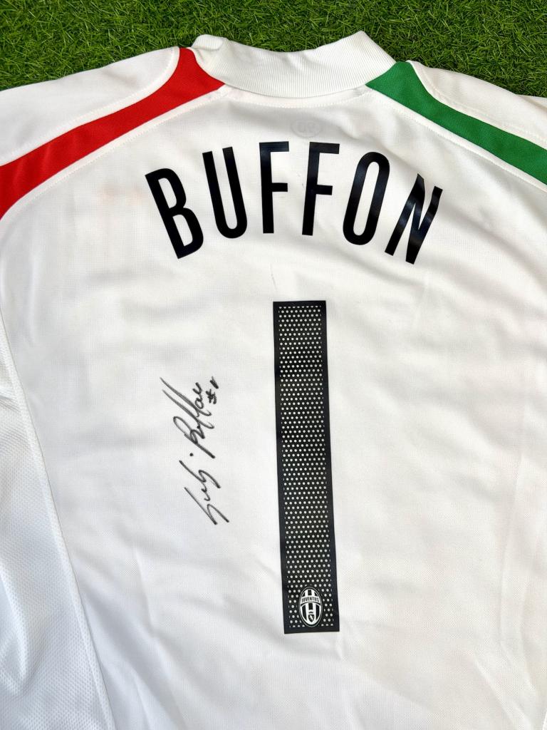 Autografo di Gigi Buffon su maglia portiere della Juventus stagione 2005/2006, caratterizzata dal colore bianco con inserti tricolore sulle spalle e design Nike con pannelli traspiranti. Sul petto sono presenti lo sponsor commerciale Tamoil, lo swoosh Nike ricamato e lo stemma Juventus con dicitura celebrativa del centenario del primo scudetto (1905–2005), affiancato dallo scudetto tricolore.