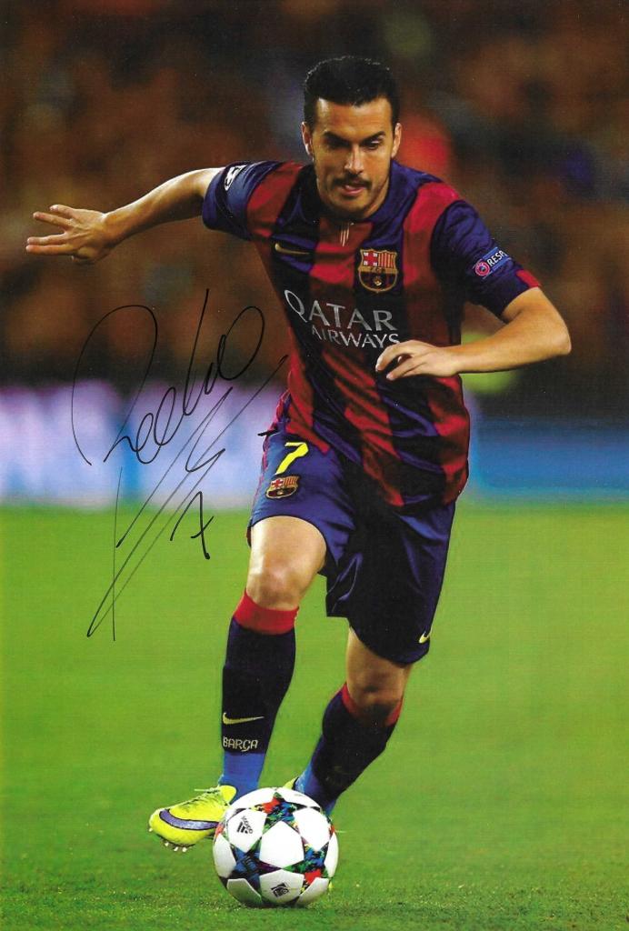 Autografo di Pedro Rodríguez, ala del Barcellona e campione del mondo. Fotografia in maglia blaugrana firmata in pennarello nero.