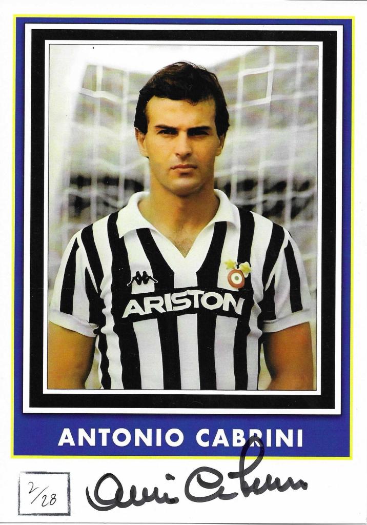 Autografo di Antonio Cabrini, terzino della Juventus e campione del mondo. Cartoncino ufficiale numerato 2/28 firmato in pennarello nero.