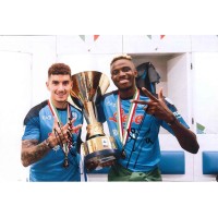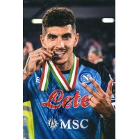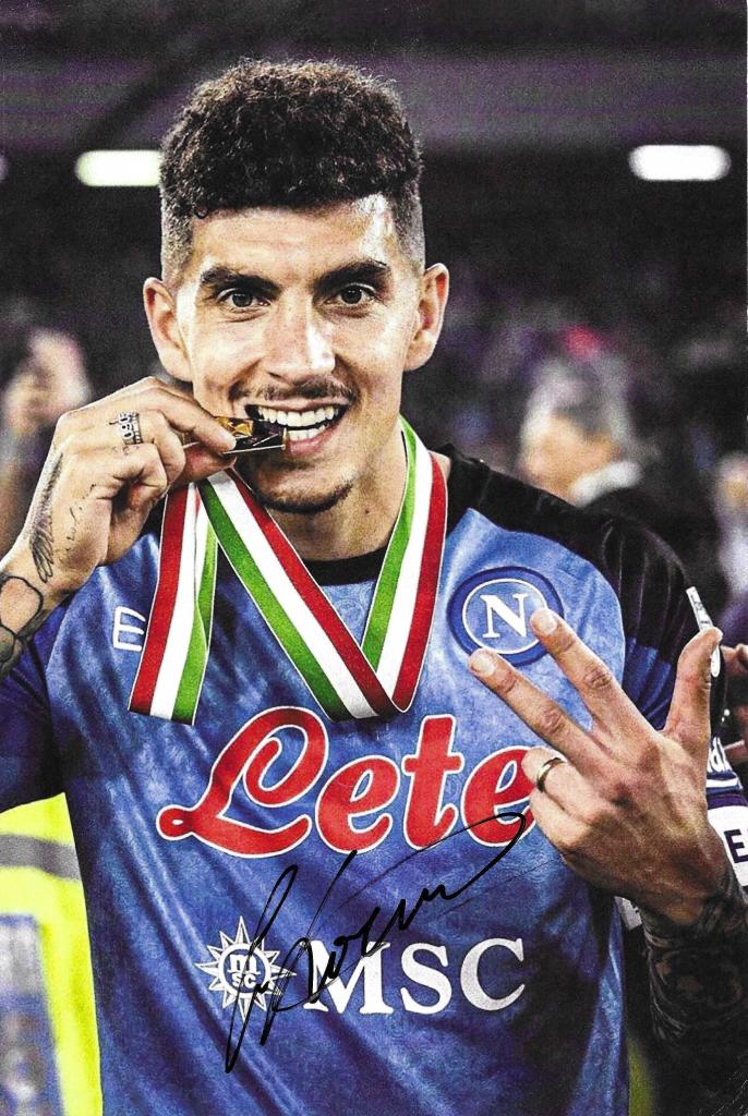 Autografo di Giovanni Di Lorenzo su fotografia a colori — morde la medaglia da campione d'Italia in maglia azzurra del Napoli con la coccarda tricolore al collo — firma in pennarello nero al centro.