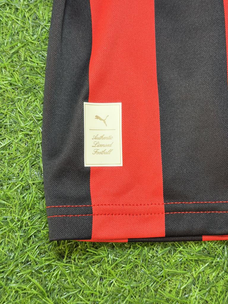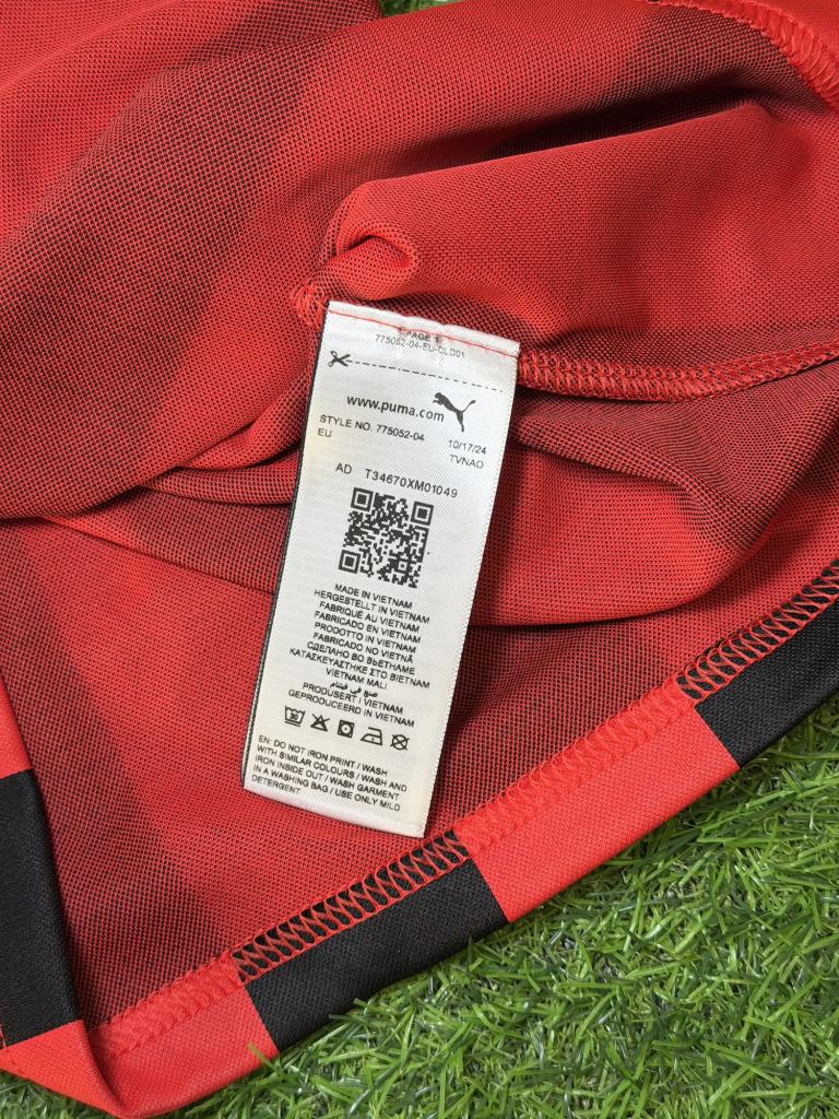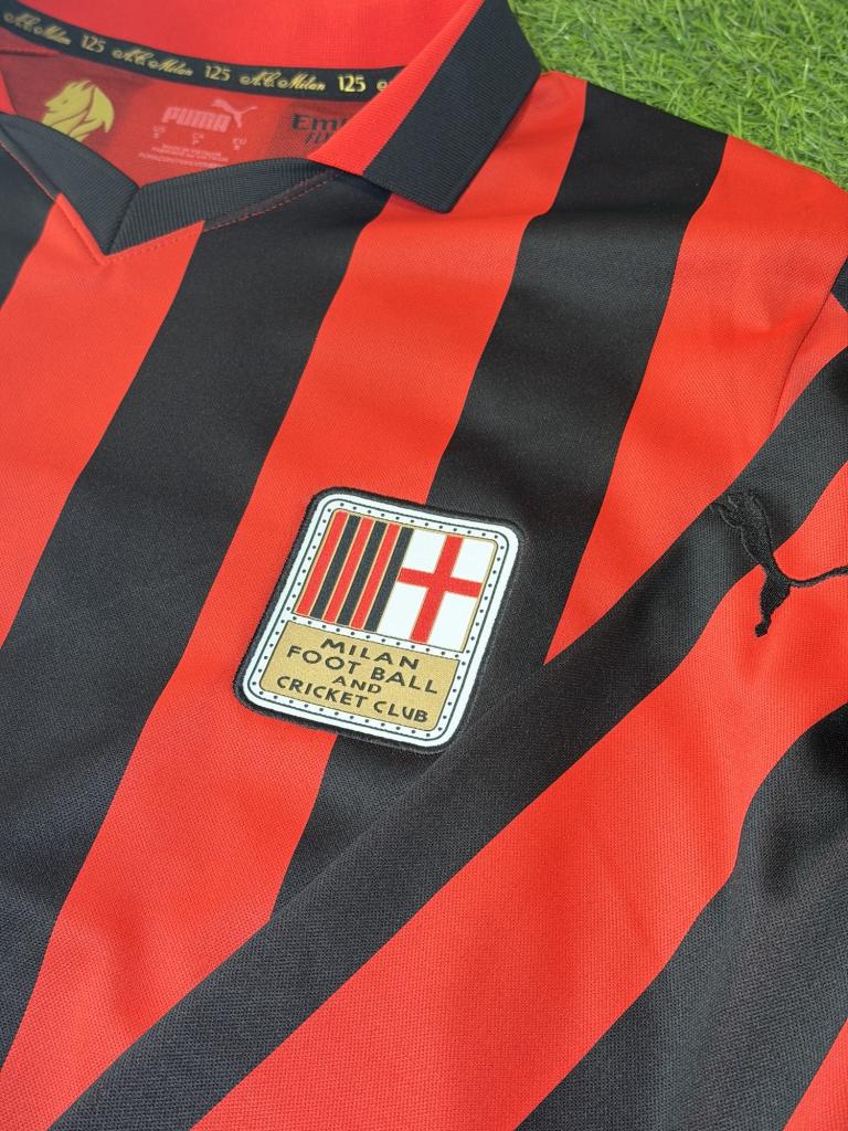 Autografo Franco Baresi su maglia Home AC Milan stagione 2024/2025 in versione celebrativa 125 anni, caratterizzata dalle classiche strisce rossonere e dal design Puma con colletto a polo. Sul petto è presente lo stemma storico “Milan Football and Cricket Club” utilizzato per l’anniversario, accompagnato dal logo Puma e dallo sponsor Emirates Fly Better.