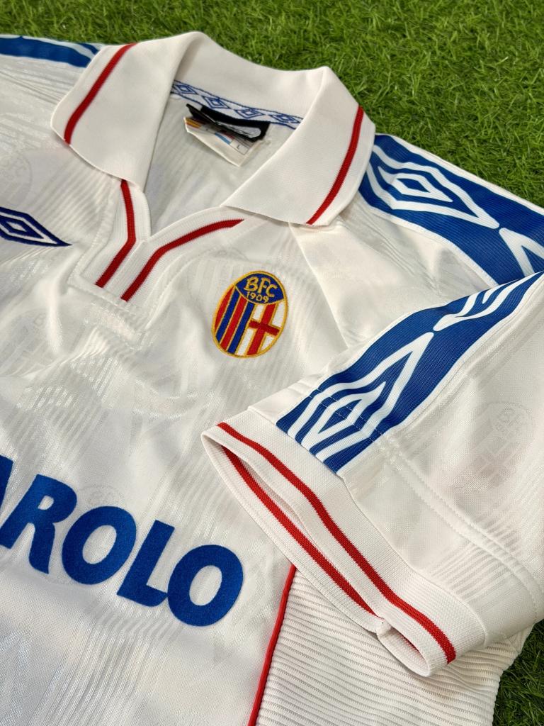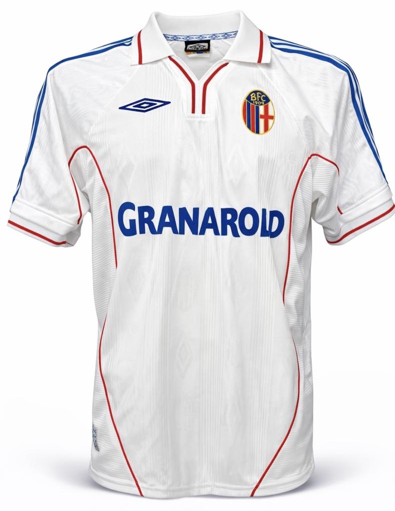 Autografo Beppe Signori su maglia Away Bologna FC stagione 2000/2001 realizzata da Umbro, caratterizzata dal design bianco con dettagli blu e rossi e inserti grafici tono su tono nel tessuto. Presenta colletto a polo con finiture rosse, logo Umbro ricamato e stemma BFC 1909 sul petto, accompagnati dallo sponsor commerciale Granarolo in blu.
