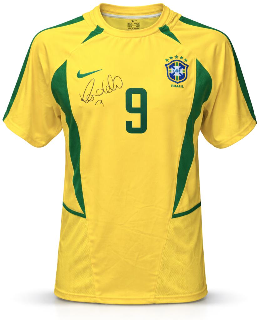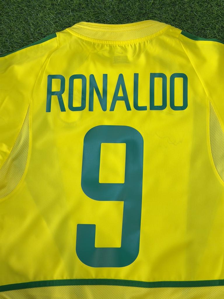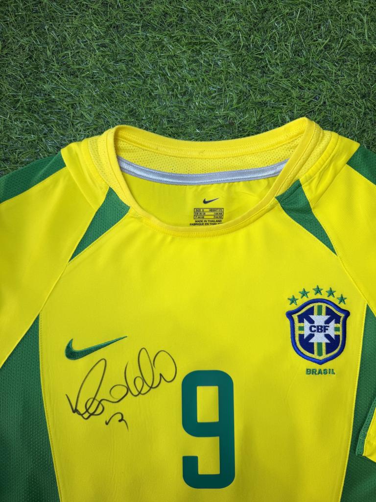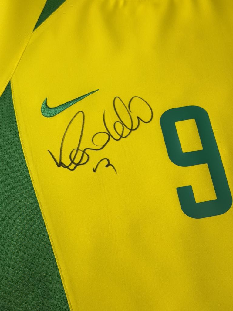 Autografo di Ronaldo Luís Nazário de Lima su maglia Brasile Home 2002 versione store, caratterizzata dal classico colore giallo con inserti verdi, realizzata da Nike per la Nazionale brasiliana nei primi anni 2000.