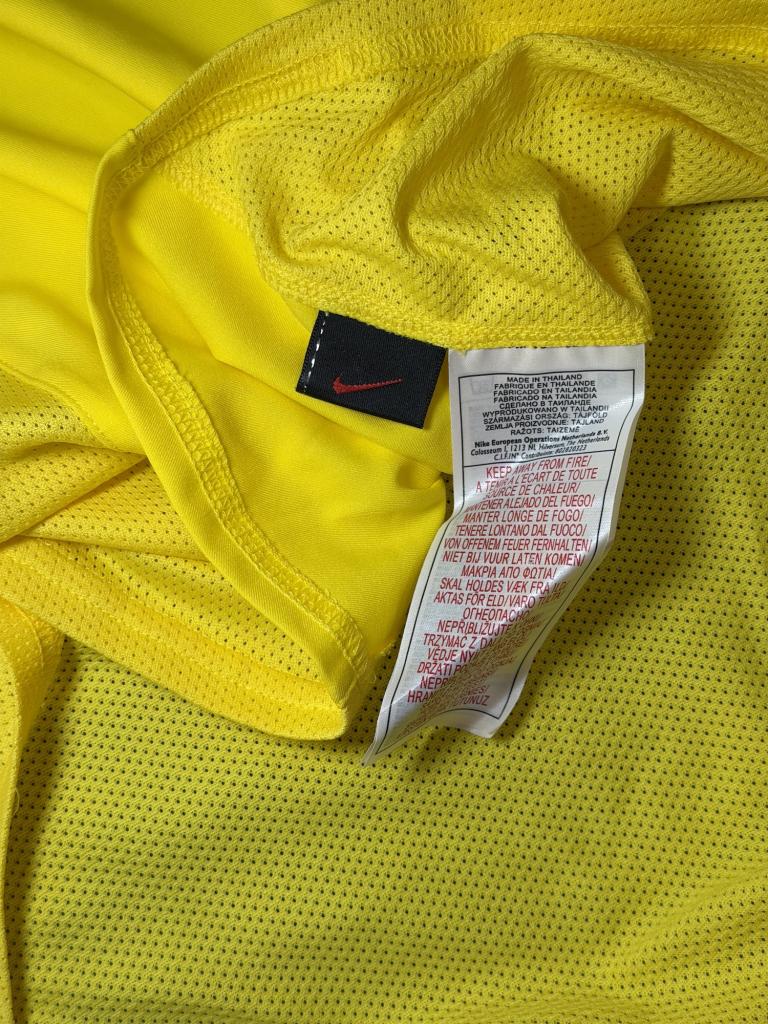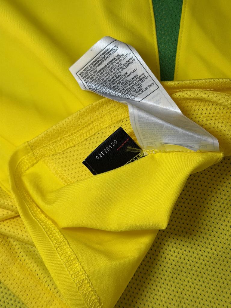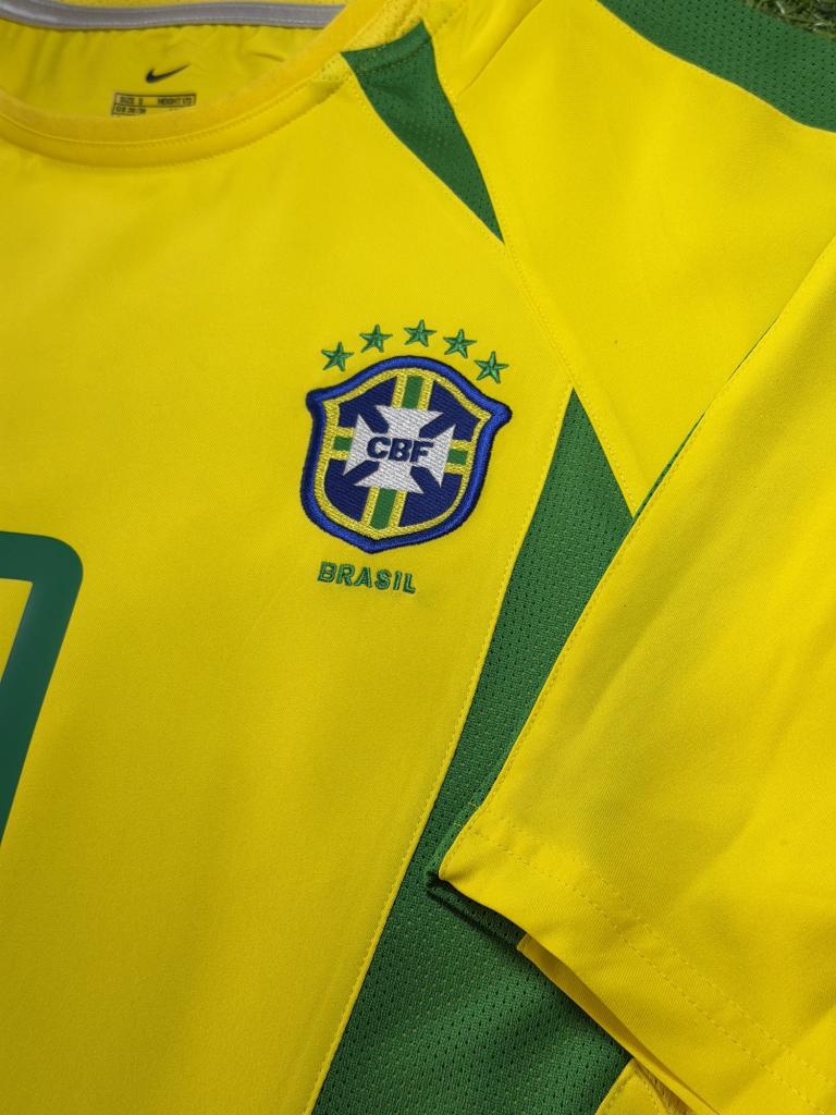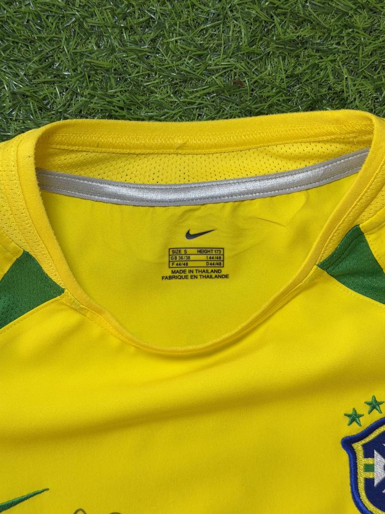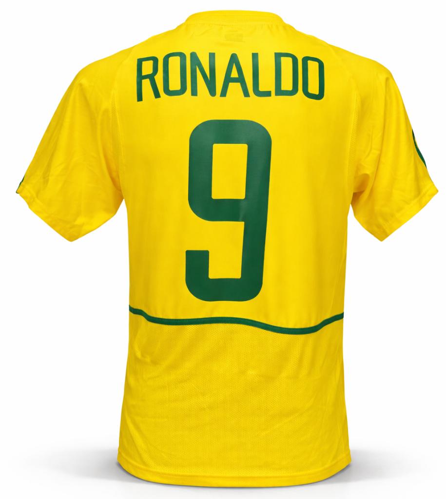 Autografo di Ronaldo Luís Nazário de Lima su maglia Brasile Home 2002 versione store, caratterizzata dal classico colore giallo con inserti verdi, realizzata da Nike per la Nazionale brasiliana nei primi anni 2000.
