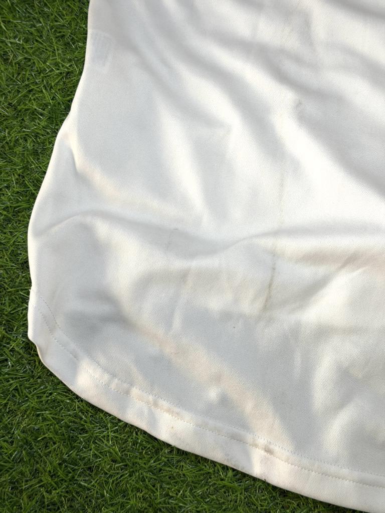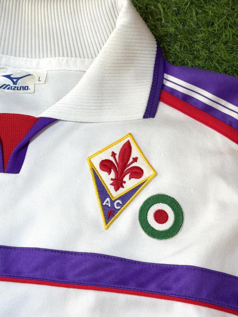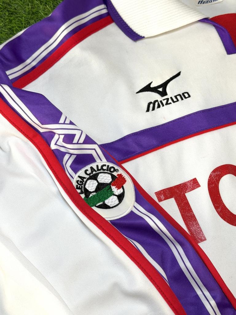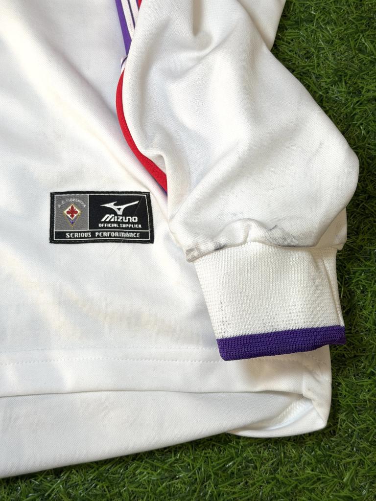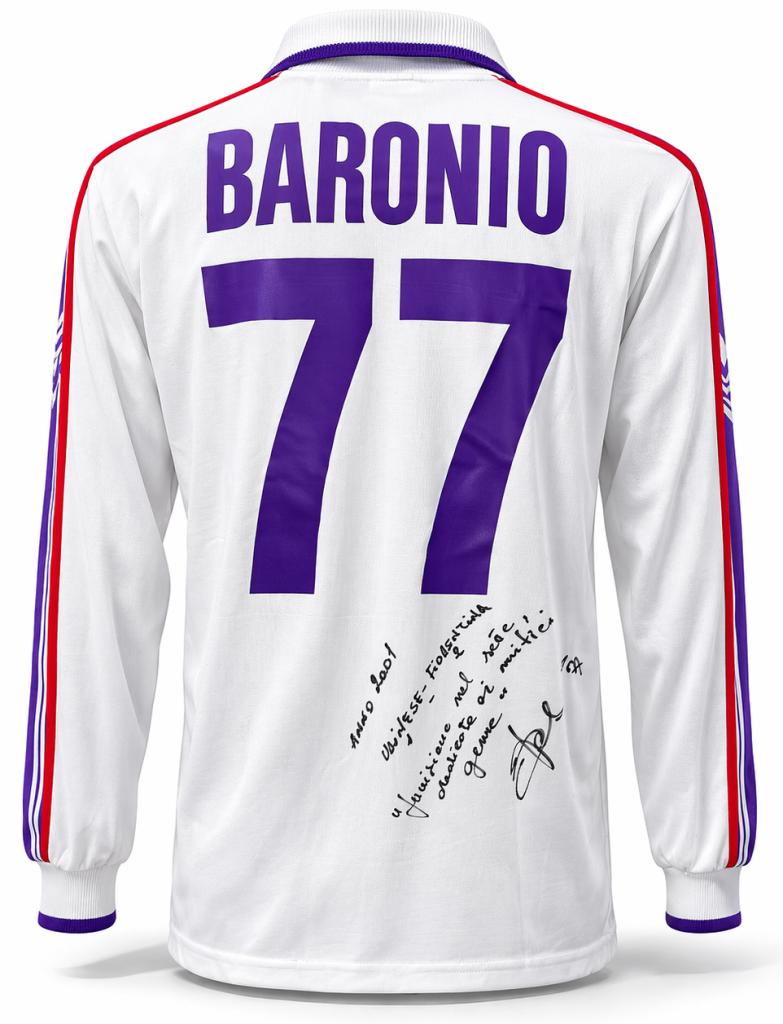 Autografo di Roberto Baronio su maglia Fiorentina Away Player Issued stagione 2001/02 a maniche lunghe, caratterizzata dal design bianco con dettagli viola e rossi e sponsor commerciale Toyota sul petto. La maglia, realizzata da Mizuno, presenta lo stemma della Fiorentina con giglio e coccarda tricolore, tipica delle competizioni nazionali dell’epoca.
