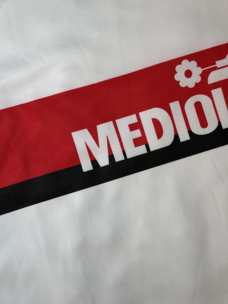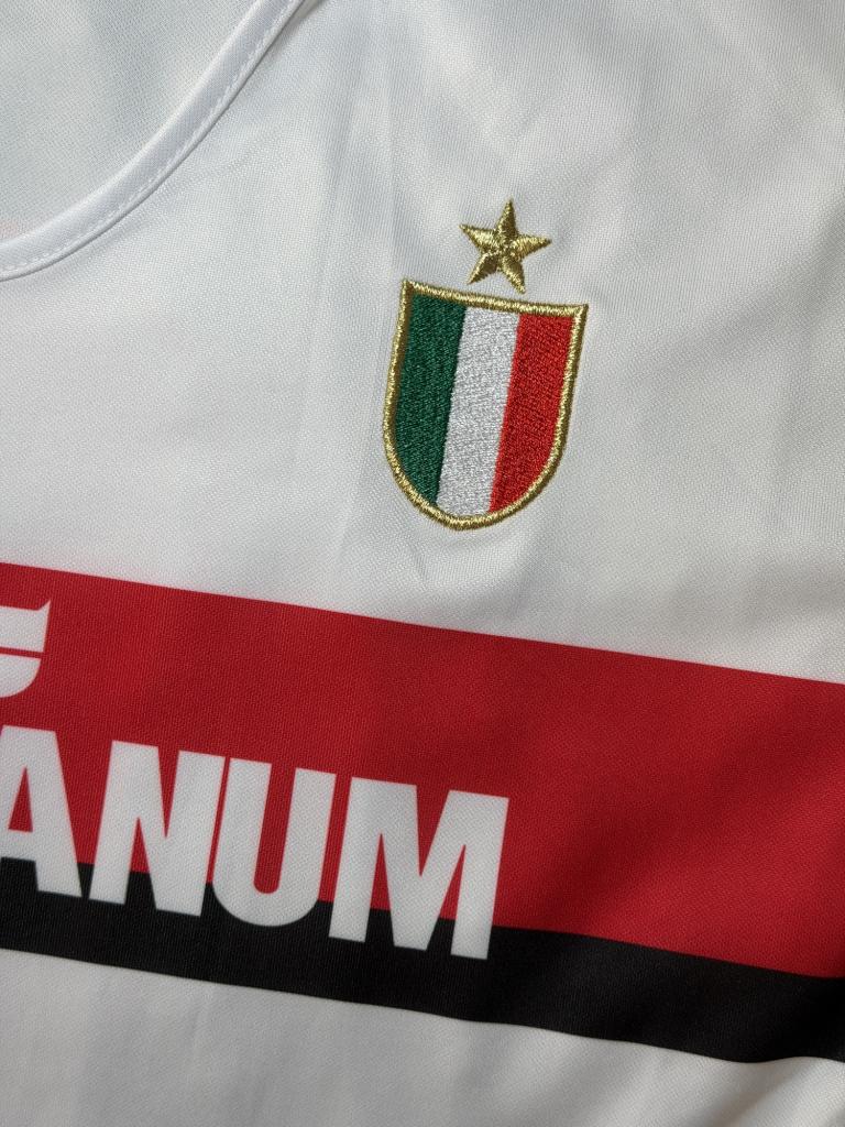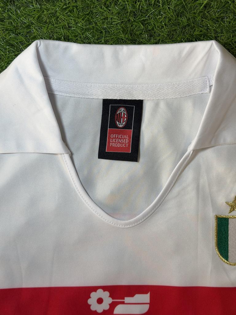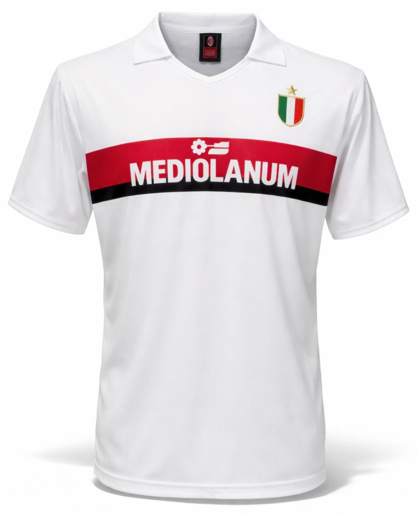 Autografo di Franco Baresi su maglia Milan Away stagione 1988/89 versione Store Replica, caratterizzata dal design bianco con banda orizzontale rossonera e sponsor Mediolanum sul petto, realizzata da Adidas.