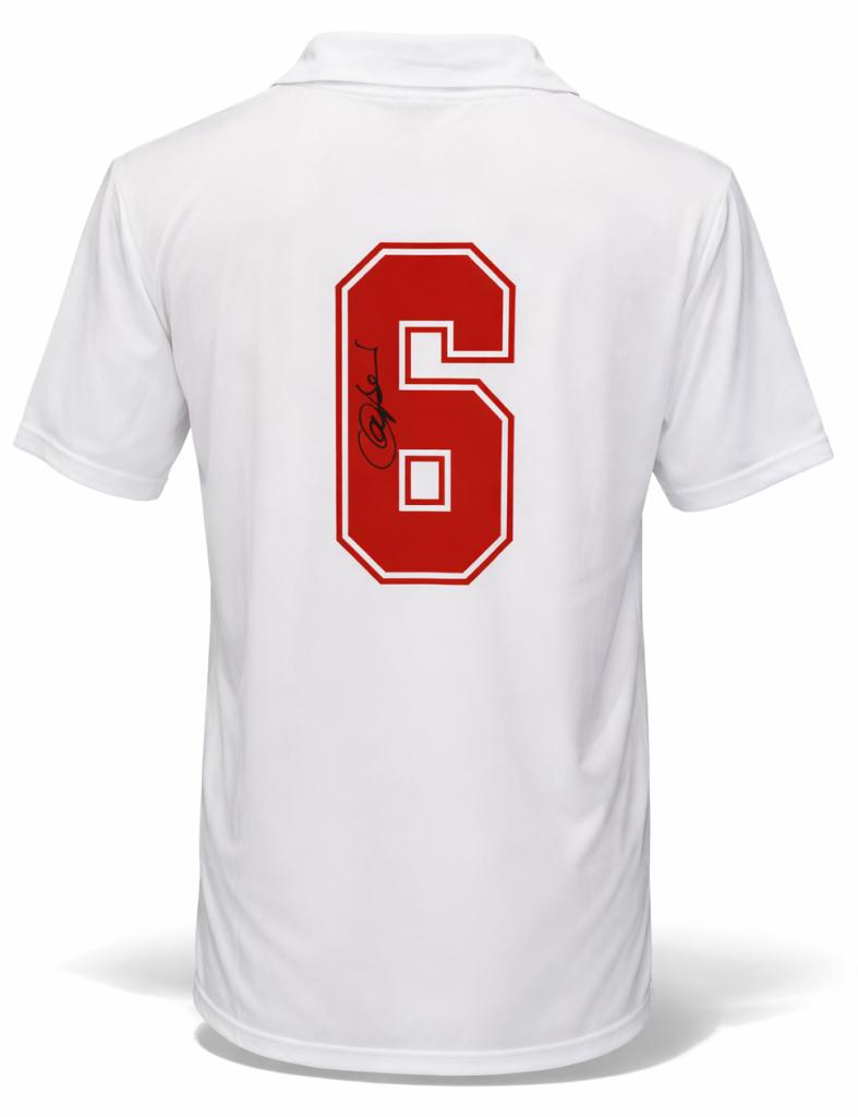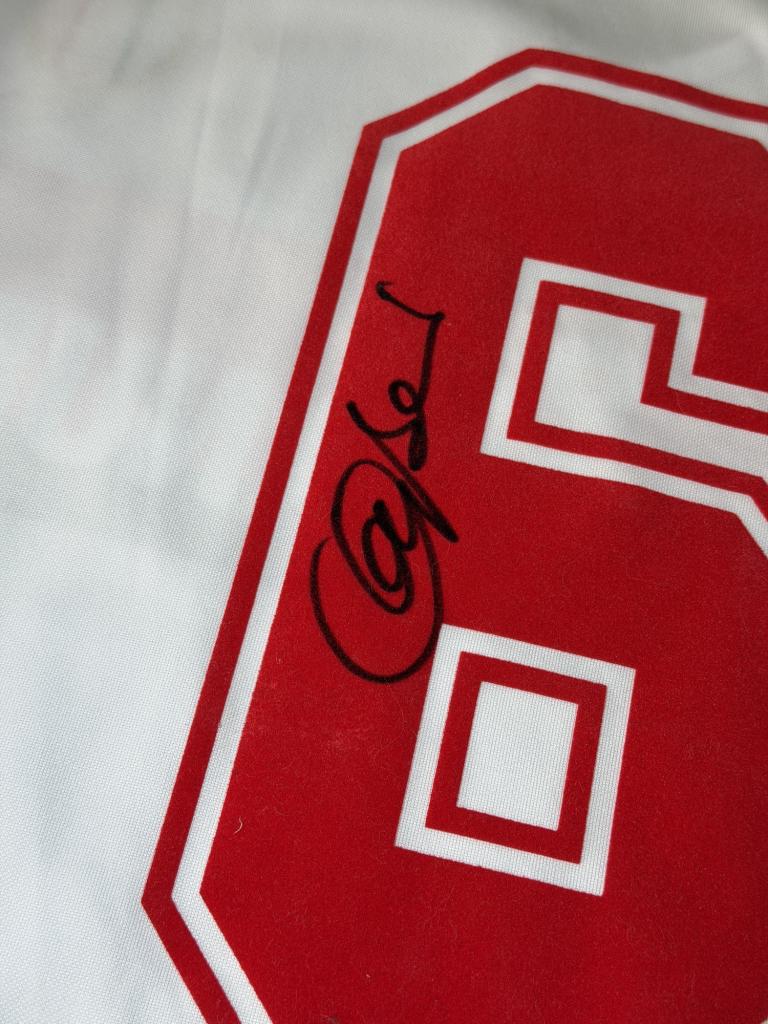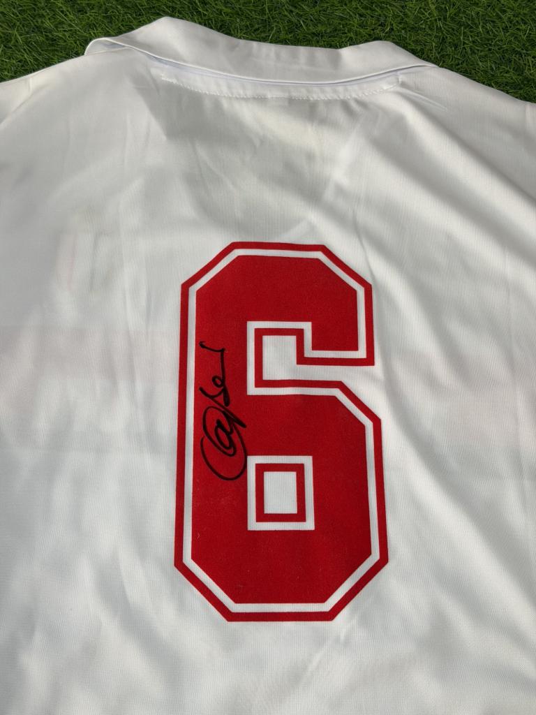 La maglia presenta lo scudetto tricolore cucito lato cuore, simbolo del titolo nazionale, e sul retro è applicato il numero 6 in velluto con autografo direttamente sul numero, dettaglio che la rende immediatamente riconoscibile e di grande impatto collezionistico.