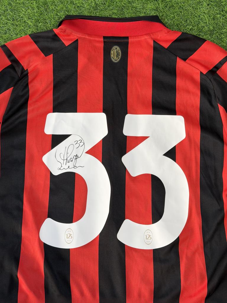 Autografo di Thiago Silva su maglia Milan 125° Anniversario stagione 2024/25 versione Store, caratterizzata dallo storico design a strisce rossonere ispirato alla tradizione del club, con stemma celebrativo dedicato ai 125 anni applicato lato cuore e sponsor tecnico Puma.
