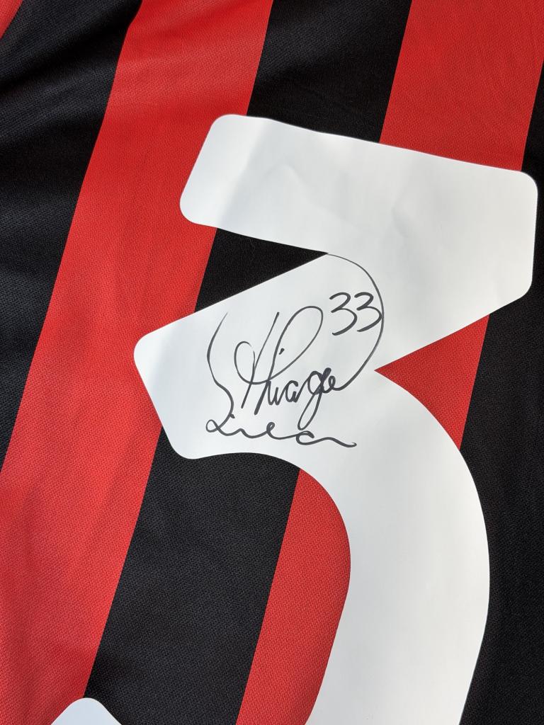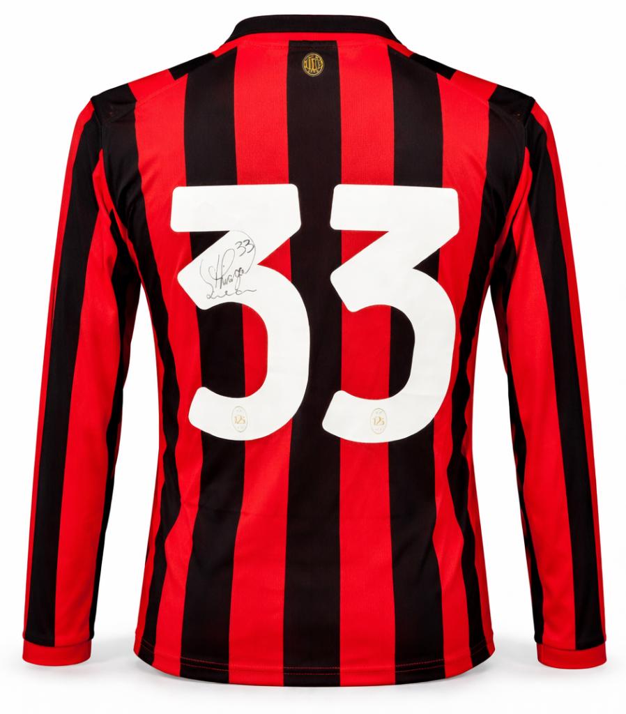 La maglia presenta maniche lunghe e uno stile classico rivisitato in chiave moderna, mentre sul retro è presente il numero 33 in bianco con autografo direttamente sul numero, elemento che ne esalta unicità e valore collezionistico.