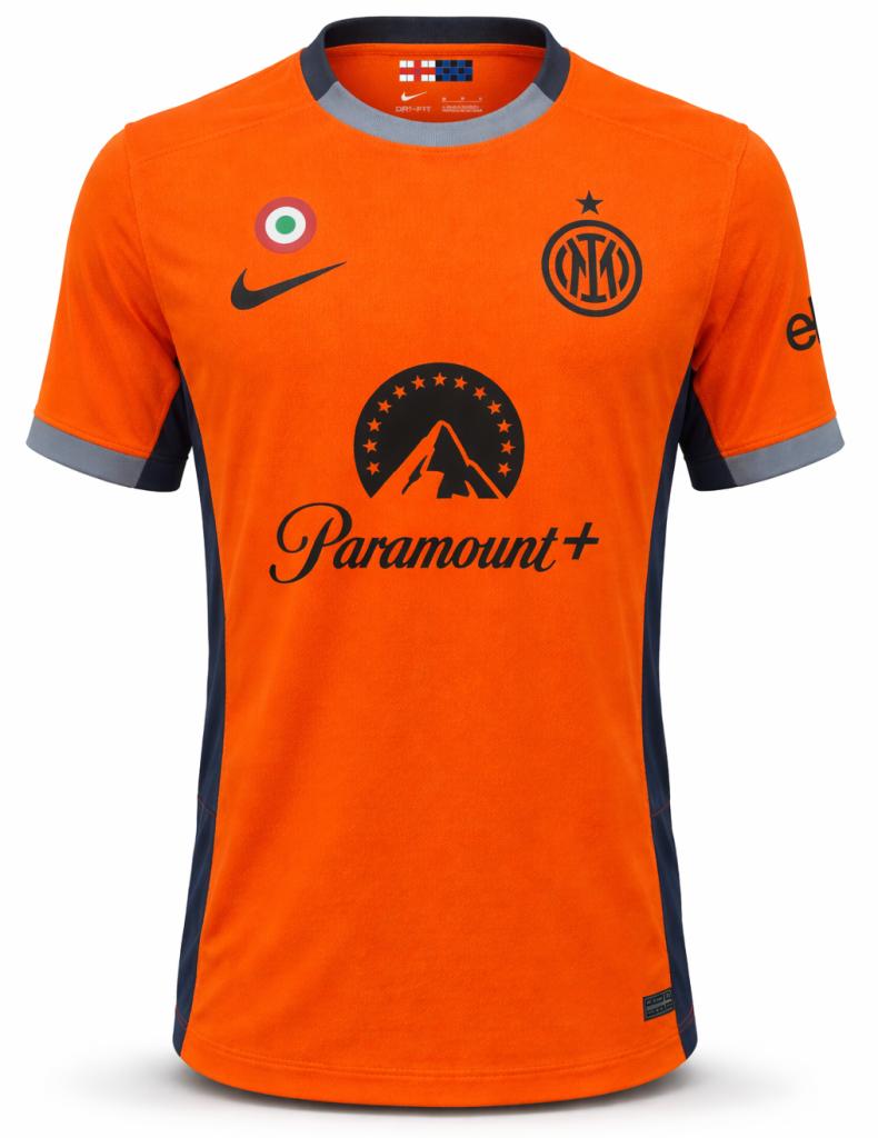 Autografo di Marcus Thuram su maglia Inter Third stagione 2023/24 versione Store, caratterizzata da un acceso colore arancione con dettagli in blu scuro, sponsor tecnico Nike e sponsor commerciale Paramount+ al centro del petto. La maglia presenta patch Scudetto e coccarda tricolore, oltre alla personalizzazione ufficiale THURAM 9 sul retro.